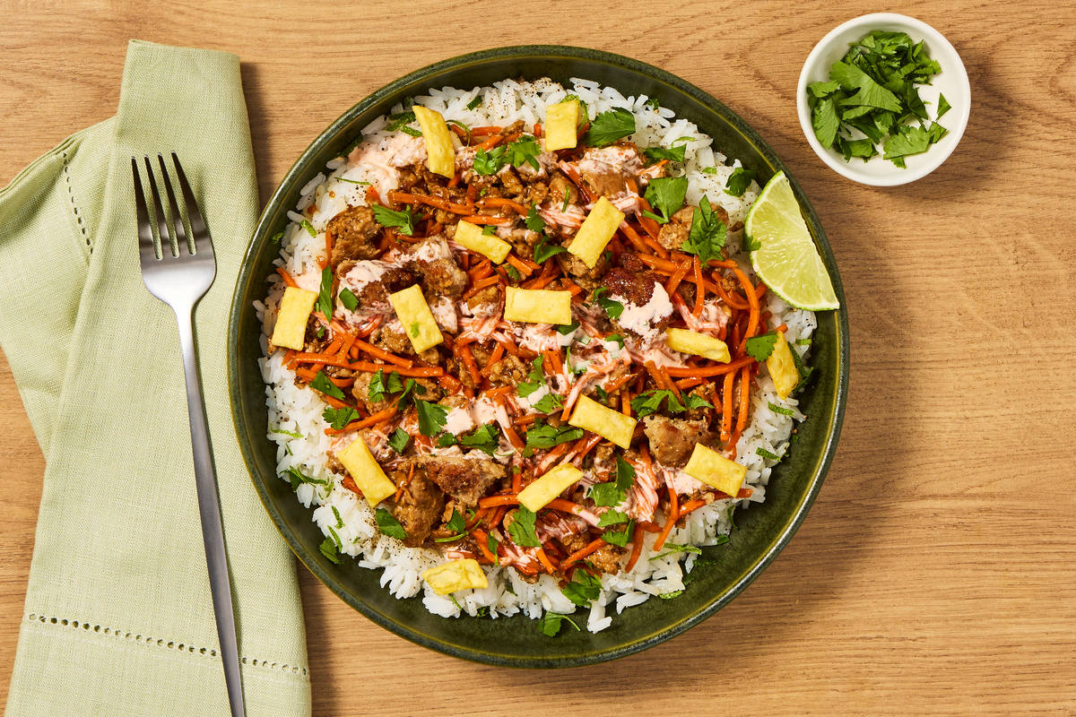 Bowls are way past “having a moment”—they’ve become a pillar of our lunches and dinners. Why? It’s simple: Everything’s better in a bowl! (Nice knowing you, plates.) But seriously, the customizable combo of carbs, protein, veggies, and a drizzle of delicious sauce cannot be denied. True to form, this rendition is fully-loaded. Buttery, lime-laced jasmine rice is topped with saucy ground pork and tender carrots. It’s all drizzled with a delectable Sriracha mayo, then topped with crispy wonton strips and fresh cilantro. One bite will have you totally bowled over.
