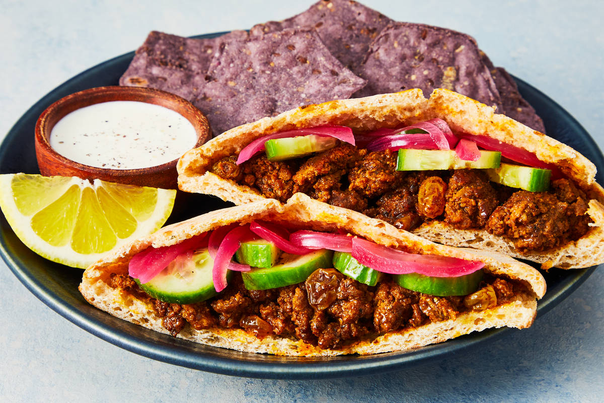 Now with leaner ground beef! You asked, we listened: This isn't the HelloFresh you remember. Bigger menu. Upgraded recipes. Increased portion sizes. More variety. The best way to cook dinner just got BETTER. Pita pockets: making portable food possible since...the beginning of recorded culinary history?! Our chefs ditched the ole cave fire for a stove and swapped the spit-roasted game for savory shawarma-spiced beef sautéed with plump golden raisins. It’s all tucked into a fluffy, warm pita pocket layered with seasoned cucumber, quick-pickled red onion, and a tangy lemon cream sauce. With a side of crunchy blue corn chips for swiping up any tasty loose ends, you’re good to go (or stay)—no hunting and gathering required!