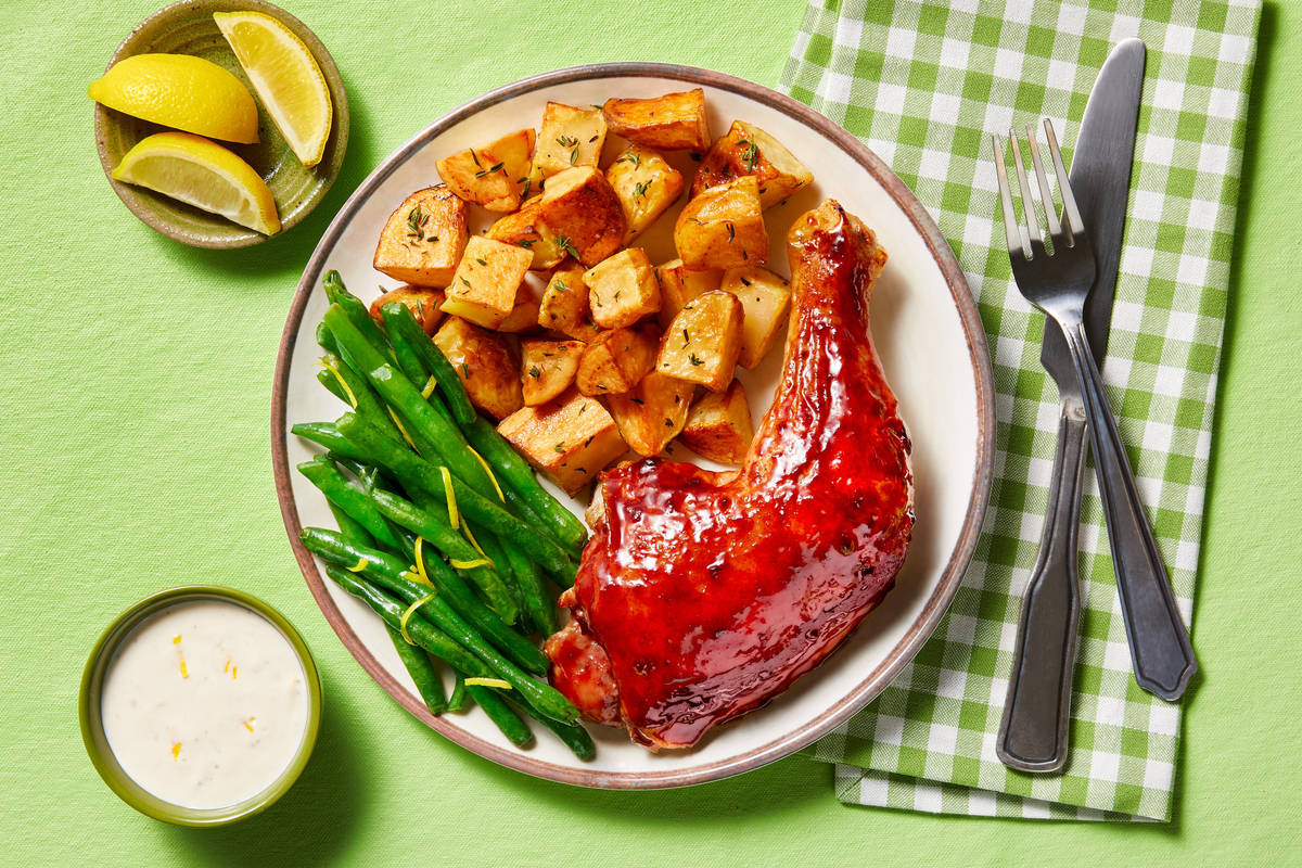 When it comes to chicken, we’re always looking for two things: golden, crackly skin and juicy, flavorful meat. Oh, you too? Enter: these roasted chicken legs. They’re all that and then some—the “some” being a cinnamon-paprika spice rub and cherry jam glaze that really take ’em above and beyond. On the side, there’s thyme-roasted potatoes, lemon butter green beans, and a tangy roasted garlic dipping sauce. Get a leg up on dinnertime!