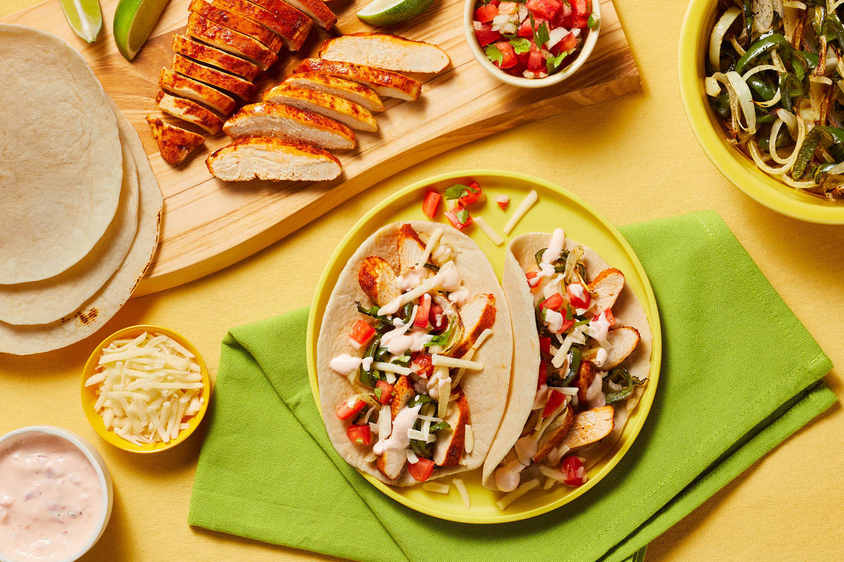 • Wrap tortillas in damp paper towels and microwave until warm and pliable, 30 seconds. Divide between plates. • Thinly slice chicken crosswise. • Serve chicken, veggies, pico de gallo, smoky red pepper crema, lime wedges, and Monterey Jack in separate bowls or plates for a build-your-own fajita bar!