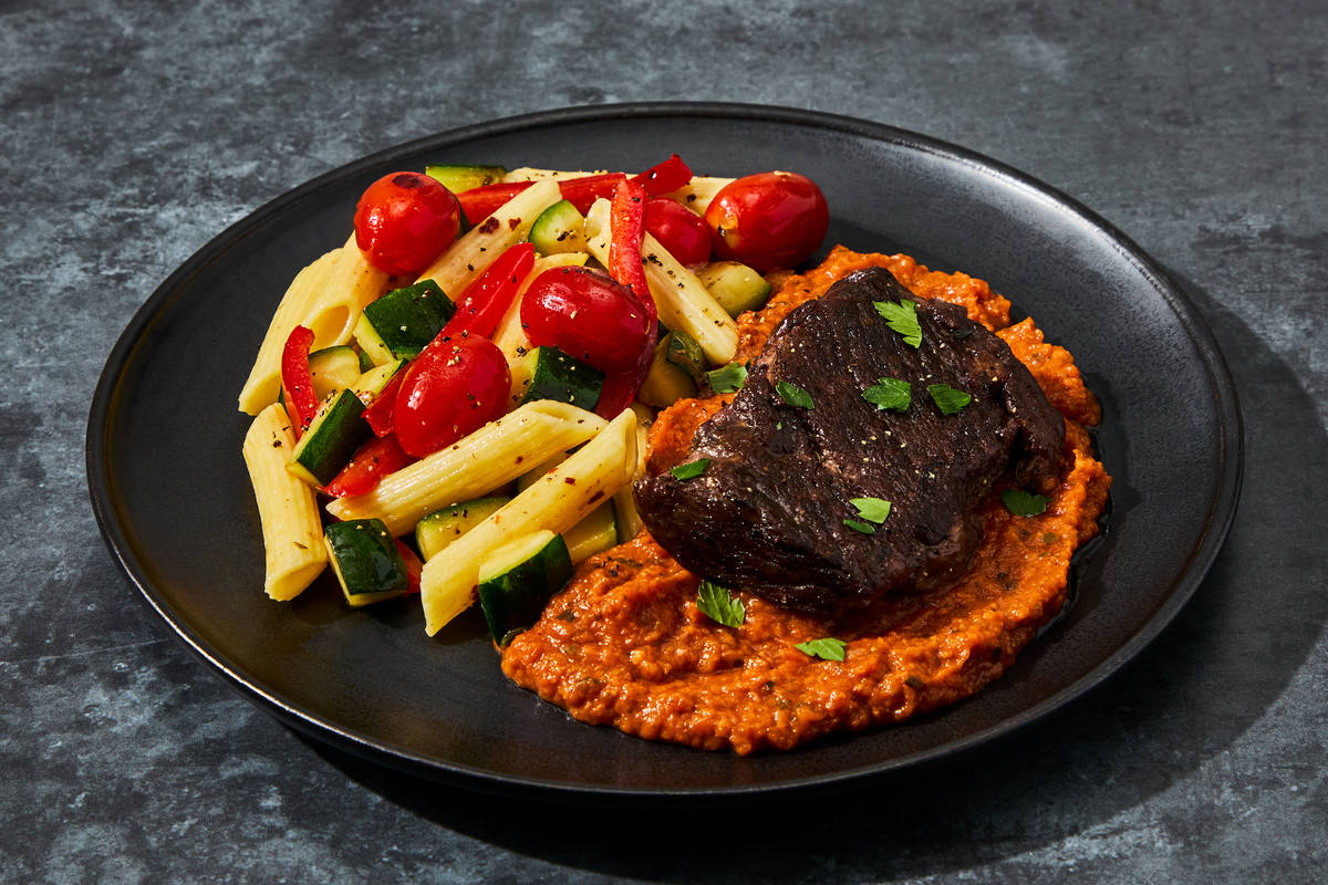 Ingredients: Beef Short Rib (Beef Short Ribs, Water, Corn Starch, Salt, Black Pepper), Cauliflower Penne (Water, Cauliflower Powder, Potato Starch, Tapioca Starch, Whole Egg, Egg White, Xanthan Gum, Konjac, Salt), Tomato Sauce (Tomato Puree (Water, Tomato Paste), Salt, Citric Acid, Onion Powder, Garlic Powder, Dehydrated Bell Peppers, Natural Flavors), Red Bell Peppers, Grape Tomatoes, Zucchini, Unsalted Butter (Pasteurized Cream, Natural Flavorings), Water, Olive Pomace Oil (Refined Olive Pomace Oil, Extra Virgin Olive Oil), Shallots, Cream Cheese (Pasteurized Milk And Cream, Salt, Cheese Culture, Stabilizers (Xanthan Gum, Carob Bean Gum, Guar Gum)), Garlic, Chardonnay Wine (Grapes, Sulfites), Toasted Garlic, Brown Chicken Stock (Chicken Stock, Mirepoix Stock (Made Of Carrot, Celery, And Onion Stocks), Salt, Bovine Gelatin, White Wine, Carrot Juice Concentrate, Yeast Extract, Celery Juice Concentrate, Onion Powder, White Wine (Sulfites), Natural Flavors), Carrots, Dried Onion Flakes, Green Onions, Lemon Juice, Tomato Paste (Tomatoes, Citric Acid), Parsley, Sea Salt, Dried Chives, Crushed Red Pepper Flakes, Tomato Powder (Tomato Powder, Silicon Dioxide (Anti-Caking Agent)), Granulated Green Onion, Toasted Onion Powder, Smoked Black Pepper (Pepper, Smoke Flavor), Toasted Garlic Powder, Granulated Garlic, Applewood Smoked Salt (Salt, Contains 2% Or Less Of Smoke Flavor), Black Pepper, Dried Oregano, Ground Fennel, Dried Parsley, Granulated Onion The nutrition facts are based off of the recommended serving size. Serving Size = 1 Tray (403g)
