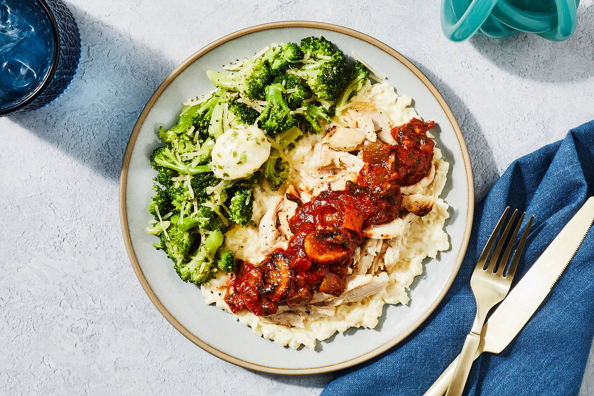 What’s not to love about roasted chicken thighs and a mix of veggies swimming in rich red wine tomato sauce? Cacciatore, or “hunter” in Italian, is a rustic, homey dish that’s a classic for good reason. This version is served over creamy Parmesan cauliflower “grits,” plus there’s a helping of roasted broccoli florets garnished with shredded Parmesan and a dollop of garlic butter.
