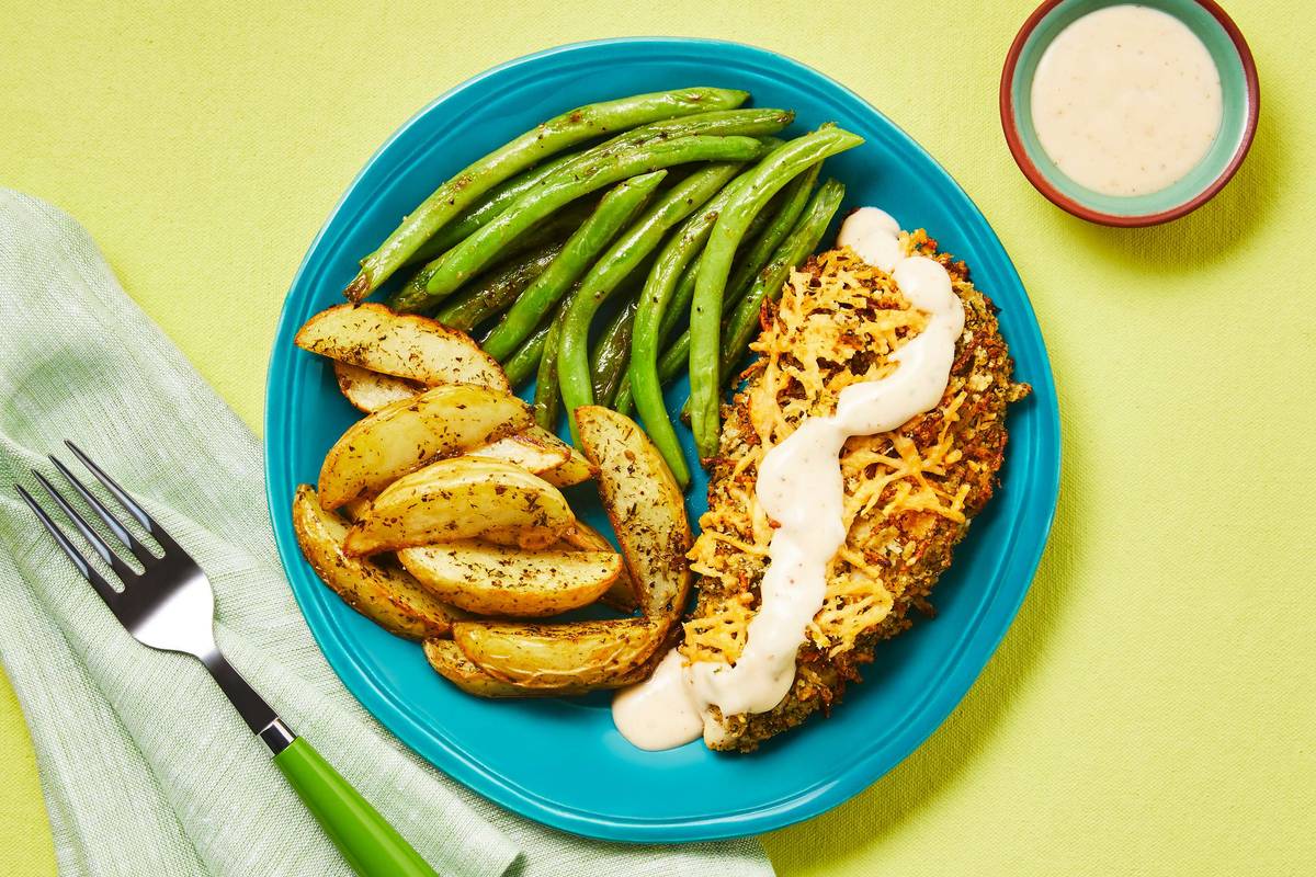 Our chefs took the best parts of the classic chicken Caesar salad and spun it into a whole new dish! You’ll skip the lettuce and spread chicken cutlets with a layer of creamy Caesar dressing, then coat with a panko and Parmesan crust. Meanwhile potato wedges roast in an herby ranch-inspired spice blend and garlicky green beans are sautéed until tender. Crispy chicken is drizzled with more dressing and plated together for a dynamic dish with familiar flavors. Who says Caesar’s only for salad?