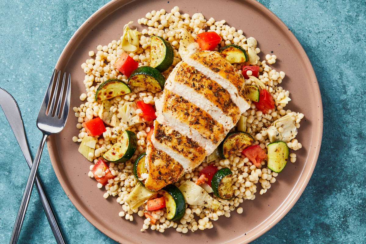 Tuscan-spiced chicken cutlets cook quickly alongside garlicky, buttery couscous with tomato and artichoke hearts. Simple sautéed zucchini rounds out the meal, making this vibrant, flavorful dinner ready in no time for a fresh and satisfying option any night of the week.
