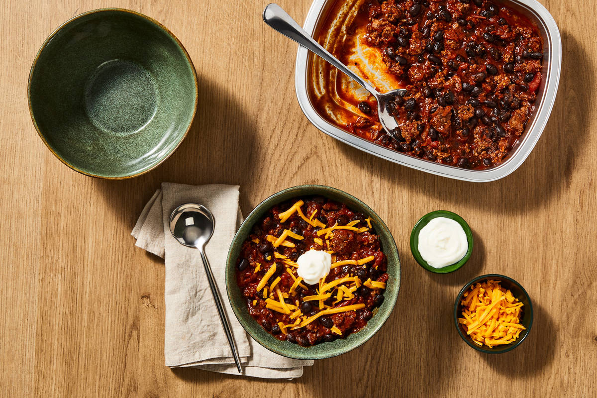 This classic beef chili comes together with black beans, crushed tomatoes, smoked paprika, and our spicy Tex-Mex seasoning base right in our convenient recyclable oven-ready tray for a super easy-to-assemble meal. Serve with cheddar and a dollop of sour cream, then toss the tray when you're done—all of the chili flavor, none of the chili dishes!