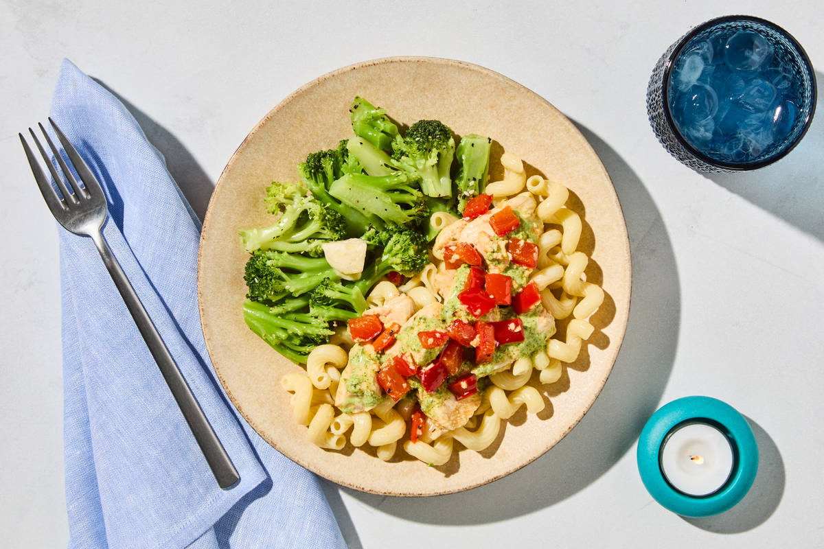 Dive into a feast of flavors and textures with this decadent dish. Succulent bites of chicken breast are marinated in spices like smoked paprika, oregano, and toasted garlic before being cooked to tender perfection. They’re tossed with al dente cauliflower cavatappi in a creamy poblano sauce with cilantro, jalapeños, and roasted red peppers. Garlicky, buttery roasted broccoli completes this hearty meal. **Ingredients:** Boneless Chicken Breast With Rib Meat, Broccoli, Cauliflower Cavatappi (Water, Cauliflower Powder, Potato Starch, Tapioca Starch, Whole Egg, Egg White, Xanthan Gum, Konjac, Salt), Red Bell Peppers, Whole Milk (Pasteurized Milk, Vitamin D3), Poblano Peppers, Neufchatel Cheese (Pasteurized Milk And Cream, Skim Milk, Cheese Culture, Salt, Guar Gum, Carob Bean Gum, Xanthan Gum), Olive Pomace Oil (Refined Olive Pomace Oil, Extra Virgin Olive Oil), Water, Heavy Cream (Heavy Cream, Milk, Gellan Gum, Sunflower Lecithin), Unsalted Butter (Pasteurized Cream, Natural Flavorings), Cilantro, Onions, Jalapeño Peppers, Garlic, Vinegar, Lime Juice (Water, Lime Juice From Concentrate), Sea Salt, Lemon Juice, Toasted Garlic, Black Pepper, Toasted Garlic Powder, Granulated Garlic, Dried Onion Flakes, Toasted Onion Powder, Granulated Onion, Paprika (Paprika And Silicon Dioxide (Added To Make Free Flowing)), Smoked Paprika, Liquid Smoke (Water, Hickory Smoke Concentrate), Dried Oregano The nutrition facts are based off of the recommended serving size. Serving Size = 1 Tray (346g)