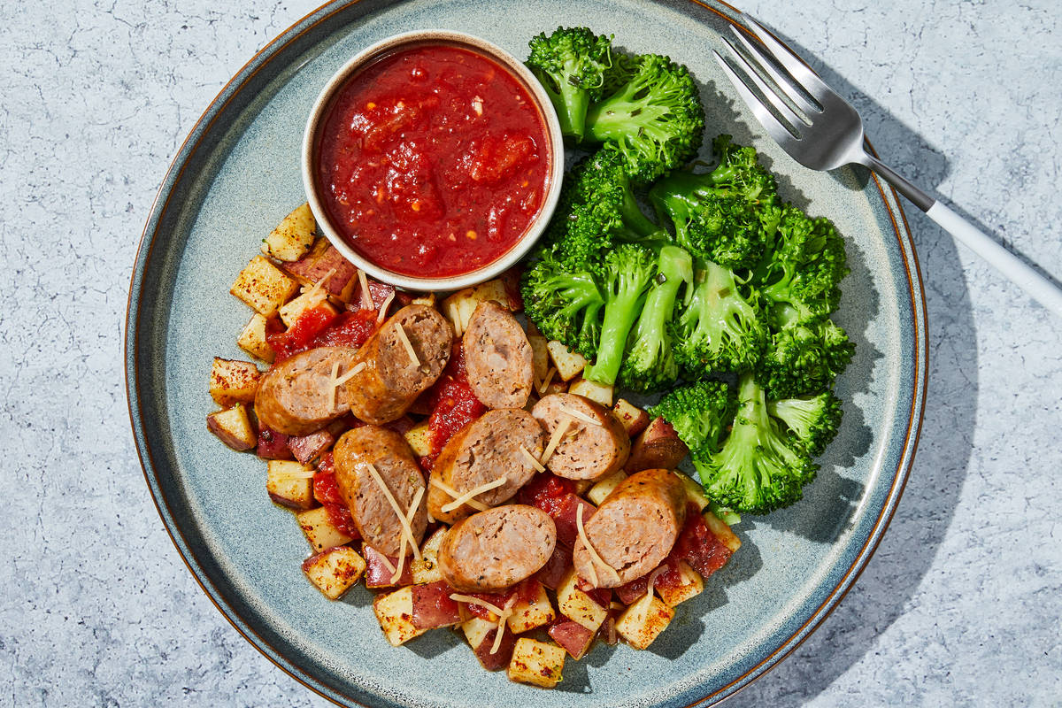 Sausage and potatoes are a perfect match: the boldness of the spiced meat is balanced perfectly by the root vegetable's mild earthiness. Here, our chefs amped up these flavors by pairing Italian sausage with garlicky tomato sauce and melty mozzarella over herb-roasted potatoes. Accompanying the entrée is broccoli draped in rich Parmesan-chive butter. **Ingredients:** Red Potatoes (Red Potatoes, Sodium Metabisulfite (Added To Maintain Color)), Broccoli, Italian Pork Sausage (Pork, Water, Salt, Spices, Paprika), Concentrated Crushed Tomatoes (Tomatoes, Salt, Citric Acid), Water, Shredded Parmesan Cheese (Pasteurized Part-Skim Milk, Cheese Culture, Salt, Enzymes, Powdered Cellulose (Added To Prevent Caking), Natamycin (A Natural Mold Inhibitor And To Protect Flavor)), Onions, Olive Pomace Oil (Refined Olive Pomace Oil, Extra Virgin Olive Oil), Unsalted Butter (Pasteurized Cream, Natural Flavorings), Garlic, Grated Parmesan Cheese (Imported Parmesan Cheese (Pasteurized Cow'S Milk, Cheese Culture, Salt, Enzymes), Water, Milk Protein, Palm Oil Blend, Disodium Phosphate, Citric Acid, Xanthan Gum, Powdered Cellulose (Anti-Caking Agent), Calcium Propionate (Preservative)), Vinegar, Paprika (Paprika And Silicon Dioxide (Added To Make Free Flowing)), Basil, Granulated Garlic, Granulated Onion, Sea Salt, Black Pepper, Dried Chives, Smoked Black Pepper (Pepper, Smoke Flavor), Dried Oregano, Crushed Red Pepper Flakes The nutrition facts are based off of the recommended serving size. Serving Size = 1 Tray (346g)