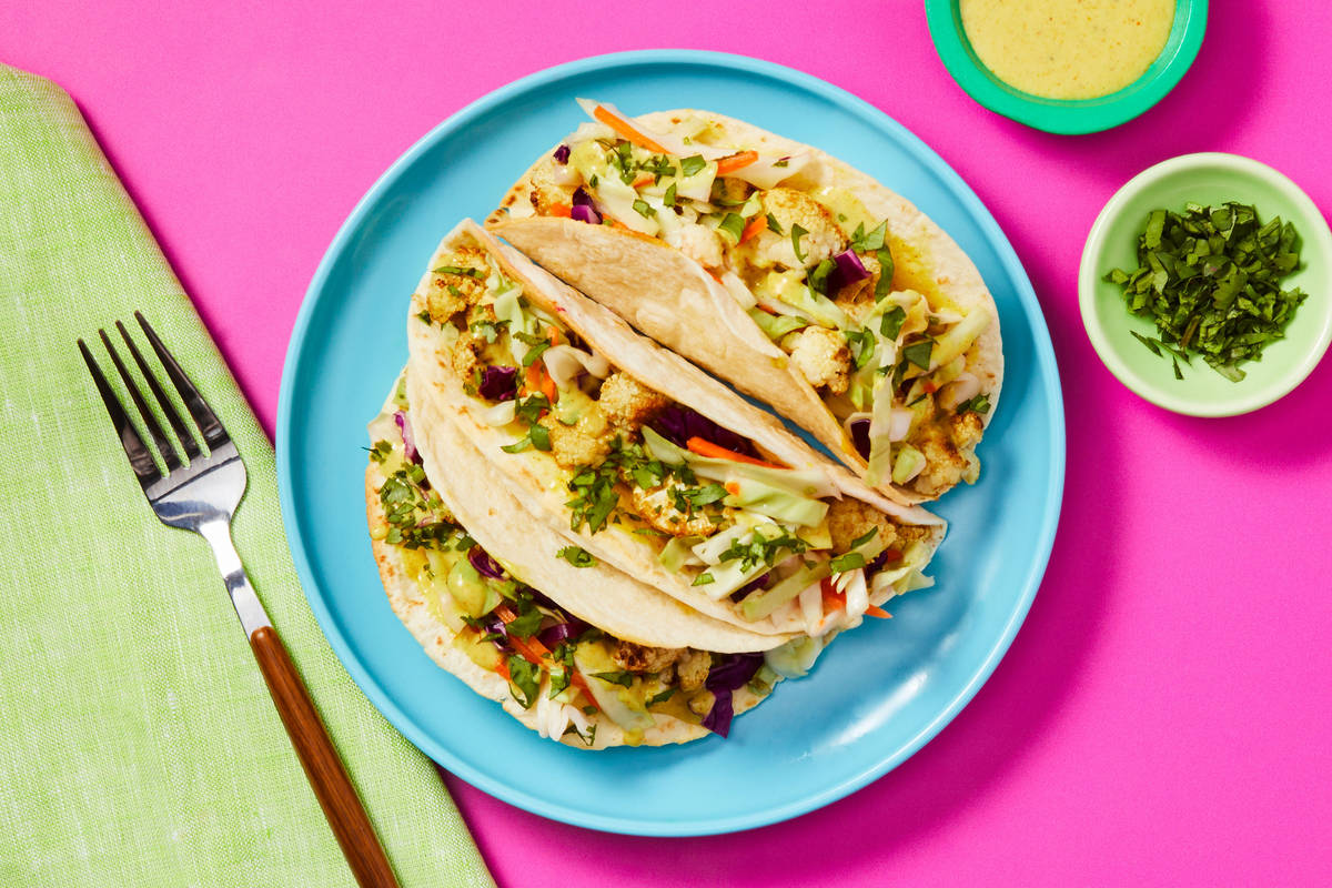 Who among us has made a better comeback than the mighty cauliflower? Once considered uninteresting (at best), this versatile vegetable can now be spotted as a pizza crust, rice substitute, and even a hearty taco filling! Here you’ll roast cumin-seasoned florets until crisp and golden. Paired with a tangy-sweet cabbage slaw, a lightly spicy curry-infused mayo, and a garnish of fresh chopped cilantro, these vegan mashup tacos are satisfying as all get-out and so loaded with bold flavors, no one will miss the meat.