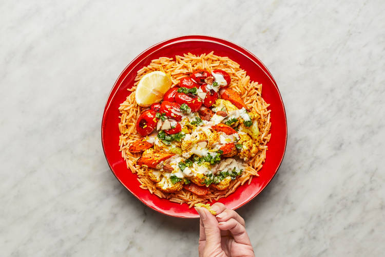 • Toss carrots and cauliflower on a baking sheet with a large drizzle of oil, Tunisian Spice Blend, a big pinch of salt, and pepper. Roast on top rack until browned and tender, 20-25 minutes.