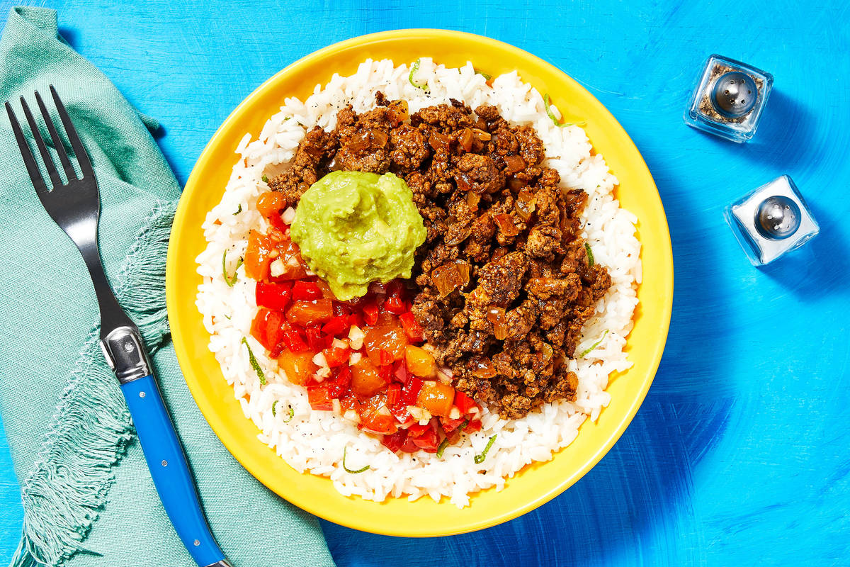 Get ready to relish this relish! Bell pepper and mango are sautéed with sugar until tender and jammy, then mixed with onion, lime juice, and olive oil for a tangy topper. The fruity garnish is perfectly paired with fluffy jasmine rice, Mexican-spiced pork, and creamy guacamole. Breezy burrito bowls with a tropical twist? Ahh… welcome to (weeknight) paradise.