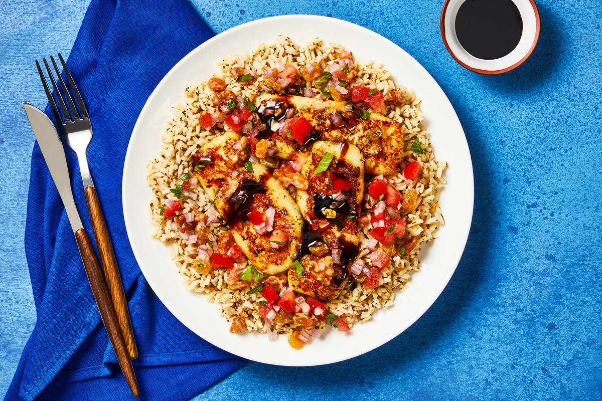 Prepare for big cheesy grins at your dinner table tonight! You’ll season our grilling cheese with Tuscan Heat Spice, then sear it in a pan and watch as it crisps on the outside, while turning wonderfully melty on the inside. For even more dinnertime delight, you’ll top the cheese with a Sicilian-inspired relish, featuring walnuts, parsley, tomato, and raisins. It’s all served over fragrant jasmine rice and drizzled with balsamic glaze for a fab finish. Say (grilling) cheese!
