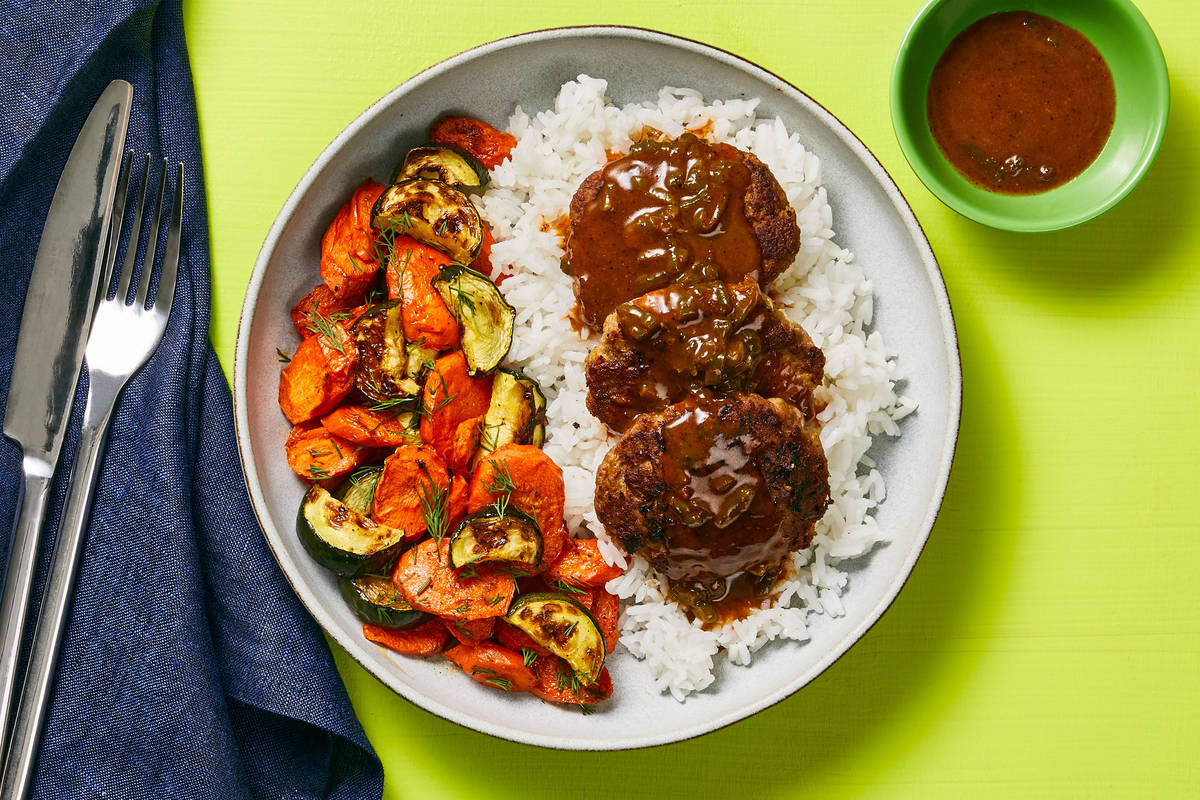 Sweet heat in the form of an apricot-harissa glaze will make you and yours go batty for these patties! Juicy ground turkey seasoned with scallions and garlic are pan-smashed into patties and seared to develop beautiful golden-brown edges. Swirl together a bold, savory-sweet mix of harissa powder, apricot jam, and butter to make a tongue-tingling glaze. Add a side of herbaceous dilly roasted carrots and zucchini and a heap of fluffy jasmine rice to round out this meal.