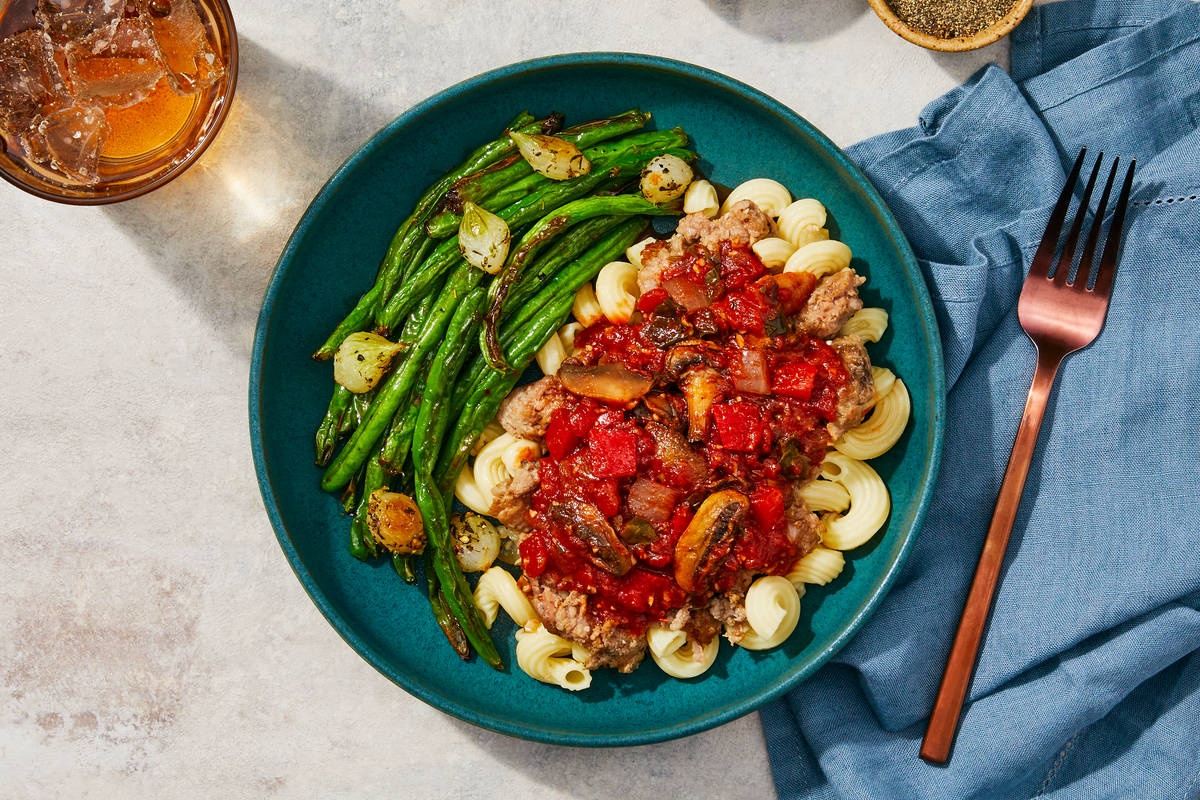 We slow-cook our spicy pork sausage bolognese sauce with sautéed mushrooms, peppers, and onions and flavored with basil and oregano. It’s served over curly cauliflower cavatappi pasta in this simple, satisfying Italian-inspired meal. On the side, enjoy salt-and-pepper-roasted green beans with thyme-infused pearl onions. **Ingredients:** Green Beans, Italian Pork Sausage (Pork, Water, Salt, Spices, Paprika), Cauliflower Cavatappi (Water, Cauliflower Powder, Potato Starch, Tapioca Starch, Whole Egg, Egg White, Xanthan Gum, Konjac, Salt), Concentrated Crushed Tomatoes (Tomatoes, Salt, Citric Acid), Pearl Onions, Water, Mushrooms, Red Bell Peppers, Olive Pomace Oil (Refined Olive Pomace Oil, Extra Virgin Olive Oil), Onions, Red Onions, Garlic, Vinegar, Green Onions, Basil, Sea Salt, Black Pepper, Crushed Red Pepper Flakes, Dried Oregano, Dried Thyme The nutrition facts are based off of the recommended serving size. Serving Size = 1 Tray (292g)