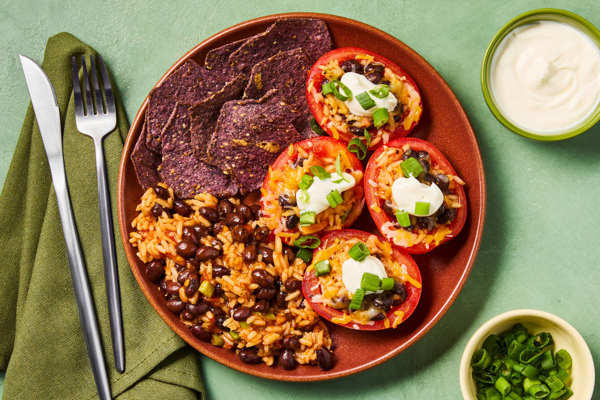 For a meatless main everyone will love, try these mildly spicy, cheesy stuffed tomatoes packed with classic Tex-Mex flavors. You’ll fill juicy tomato halves with a hearty rice and black bean filling, top them with cheese, and bake. A drizzle of tangy sour cream makes a perfect topping, and a side of tortilla chips adds crunch.