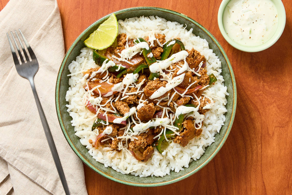 These turkey burrito bowls are as zesty and fiery as your favorite takeout version. For this 30-minute dish, you’ll sauté ground turkey with fajita veggies and Tex-Mex spices, then serve it over a bed of fluffy jasmine rice topped with creamy, tangy lime crema and a sprinkle of melty Monterey Jack. Just serve with a squeeze of lime, and you’re set!