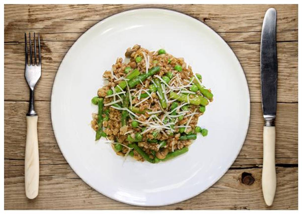 undefinedundefined protein A healthy twist on risotto using farro, a hearty whole grain. The farro is slowly cooked with stock, asparagus, and fresh peas. Finish it off with lemon, parmesan, and butter for the perfect amount of richness.