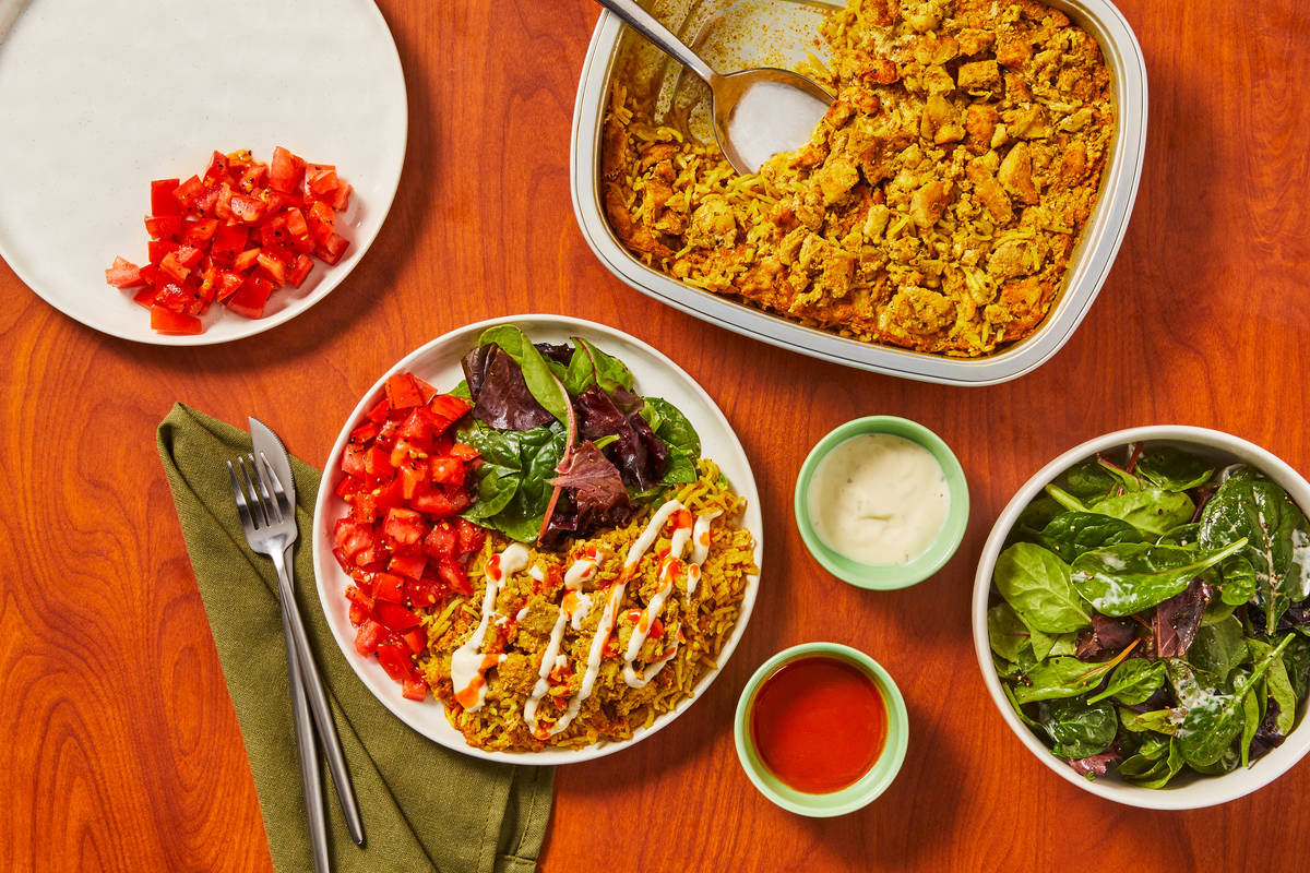 This street cart-inspired dish comes together with minimal prep and a breezy cleanup, thanks to our oven-ready trays. You’ll combine chicken with a blend of shawarma-style spices and rice, dot with butter, and pop right in the oven. Serve the chicken and rice with two sauces (street-cart style!) and a green salad—then simply toss the trays!