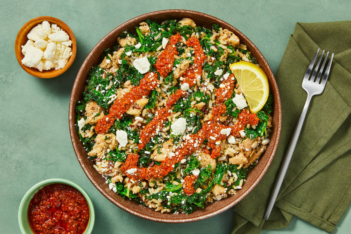 ![[SWAP DICED CHICKEN THIGHS TO CHOPPED CHICKEN BREASTS] Hyper Convenience - Romesco Chicken Grain Bowls with Kale, Lemon & Feta](https://media.hellofresh.com/q_100,w_3840,f_auto,c_limit,fl_lossy/recipes/image/68c96077b716cc1099a5f9c6-ec36d63a-84ad6b51.jpeg)