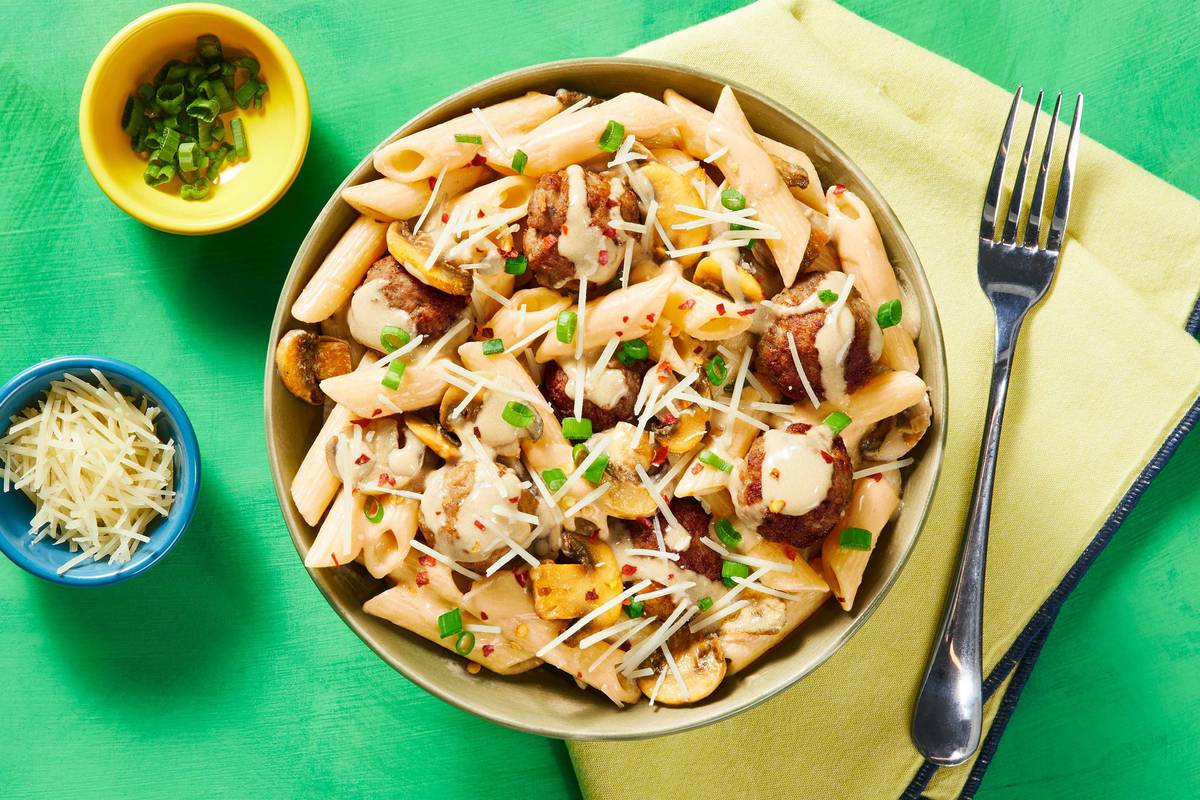 If you’re mad for mushrooms, a fan of fungi, or bonkers for buttons, this pasta will treat you right because it’s loaded with ’shrooms! They’re the backbone of this recipe, bringing all those deep, earthy flavors that you know and love. We’ve added penne, Italian-spiced pork meatballs, a creamy sauce, and a sprinkling of Parmesan cheese (they’re pals, after all!).