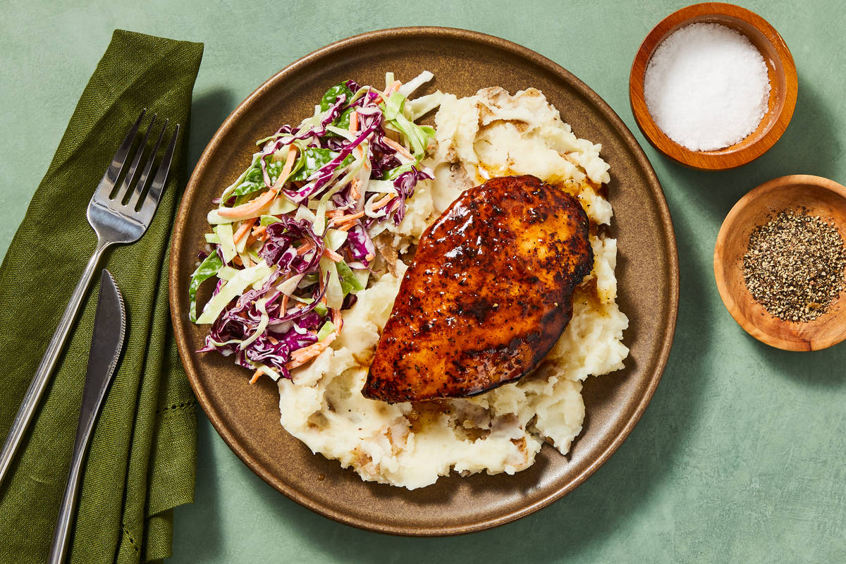 Divide mashed potatoes and coleslaw between plates. Top potatoes with chicken and spoon any remaining glaze over the top. Serve.