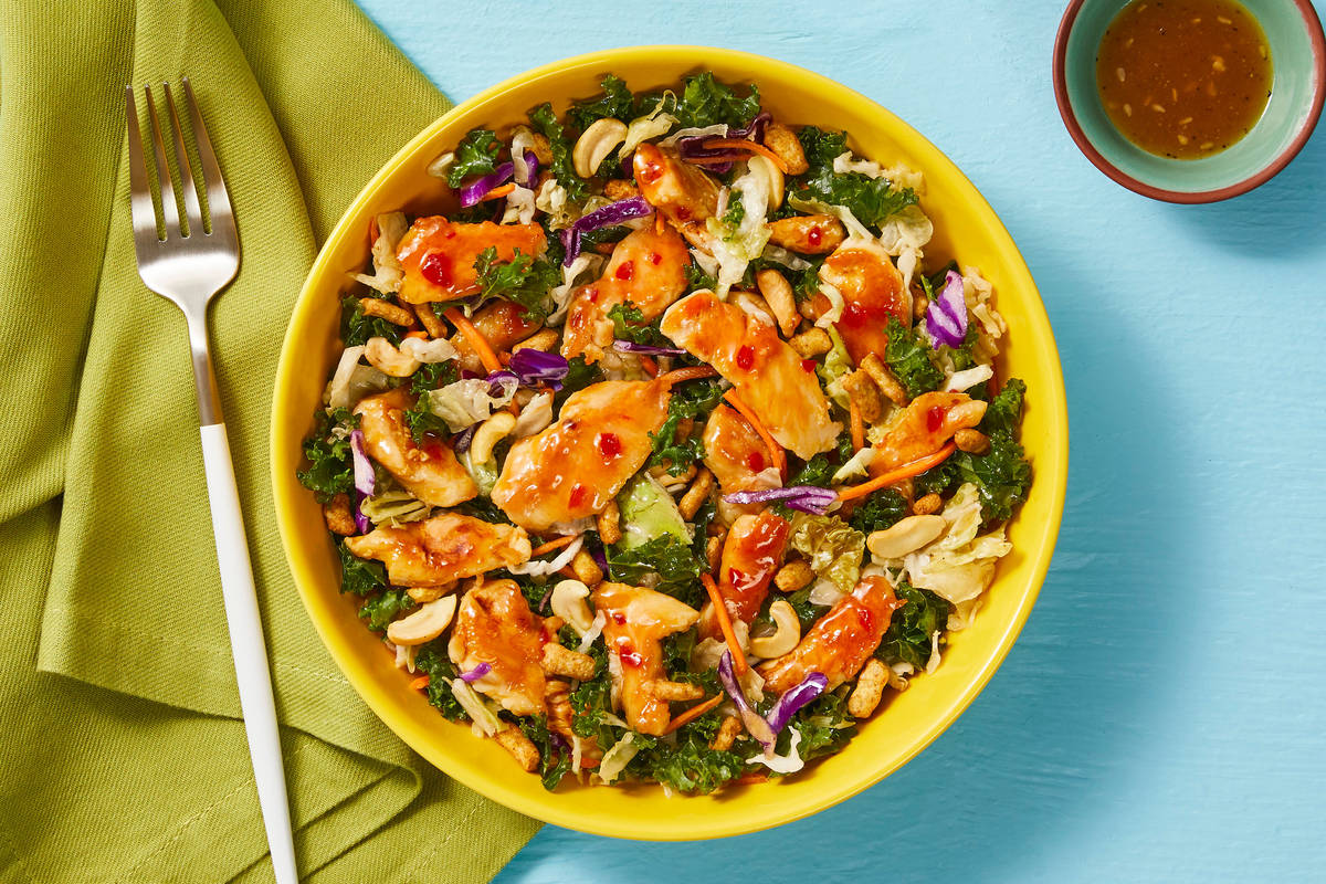 Four ingredients, and ten minutes: That’s all you need to make this delicious dinner. (Seriously!) Chicken breast strips are browned, then simmered with spicy-sweet Thai chili sauce and mandarin orange juice until sticky. It’s all served over a salad that’s tossed with crunchy toppings and a nutty sesame dressing. Now that’s a dinner dream come true!