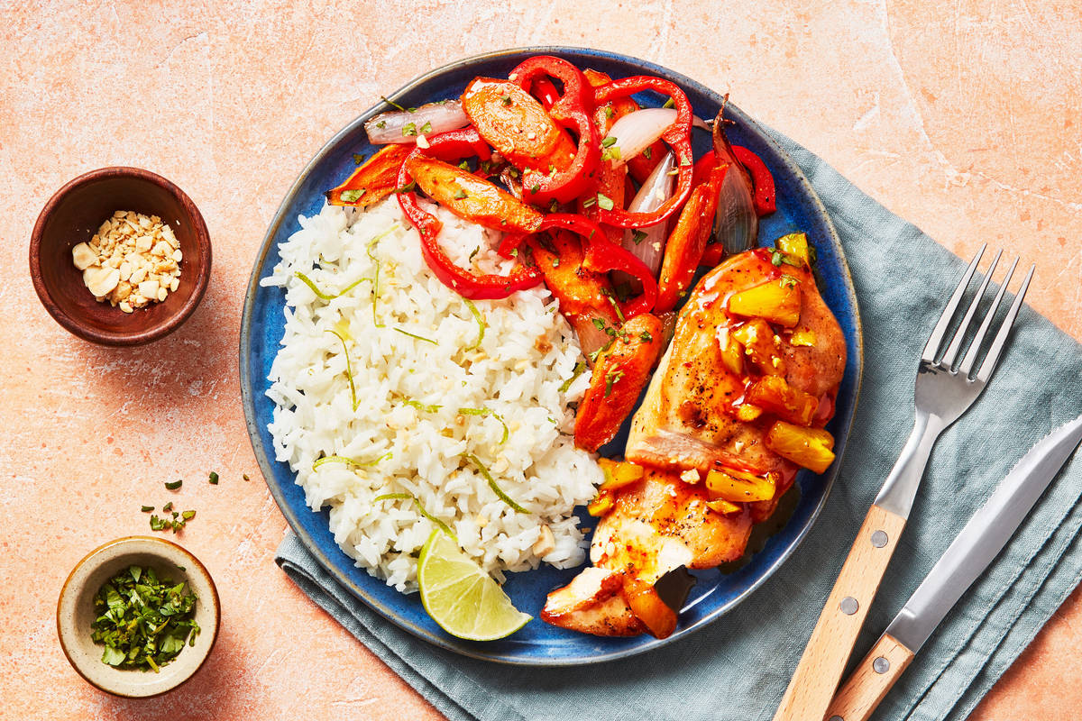 If you love sweet and savory combos, this dish will blow your mind. Thai chili sauce, charred pineapple, and lime and pineapple juices join forces to create an addictively sweet, spicy, tangy glaze for chicken. We pair with roasted carrots, bell pepper, and shallots, plus a side of aromatic ginger-lime rice, and garnish everything with peanuts for crunch. Just one bite and you’ll be living pineapple-y ever after.
