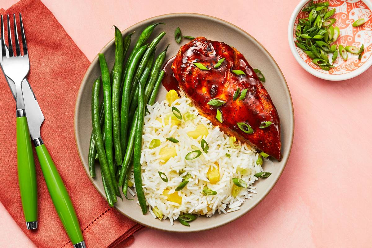 with Cherry Ancho BBQ Sauce, Green Beans & Pineapple Rice