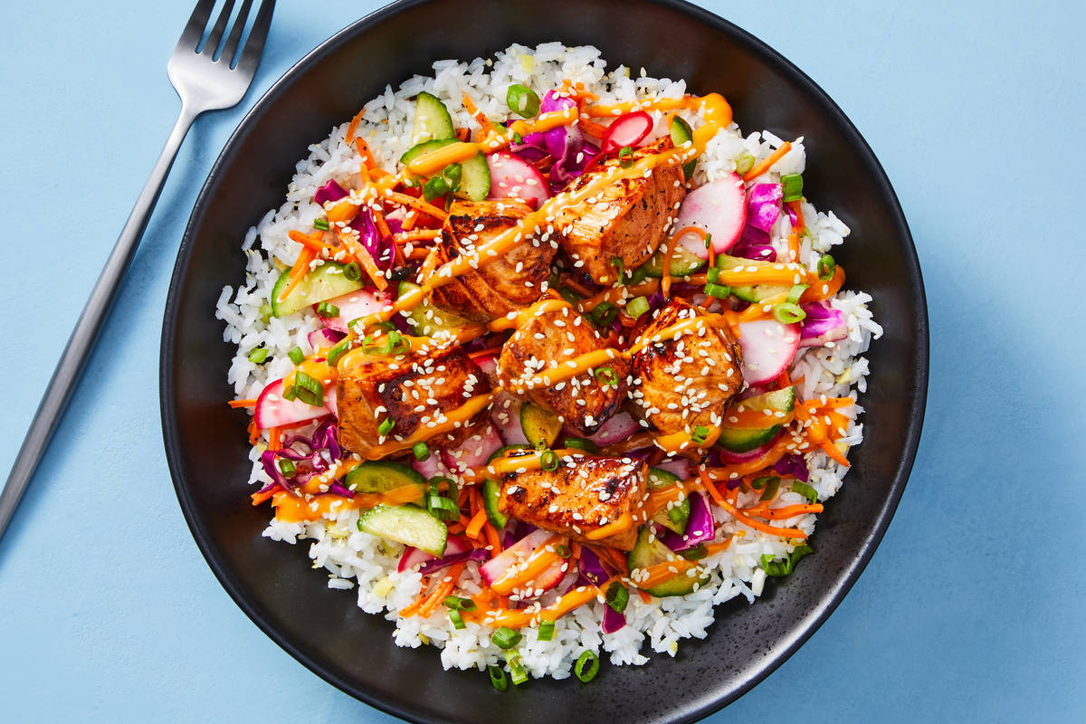 This delicious and swicy (that's sweet + spicy) Hawaiian-inspired bowl is loaded with taste bud–tingling flavors and textures! Fluffy scallion rice cradles soy-ginger-marinated salmon, seared to perfection; crisp and tangy radish and cucumber pickles; and cabbage-carrot slaw. It's all drizzled with spicy mayo and sprinkled with sesame seeds for a crackly crunch.