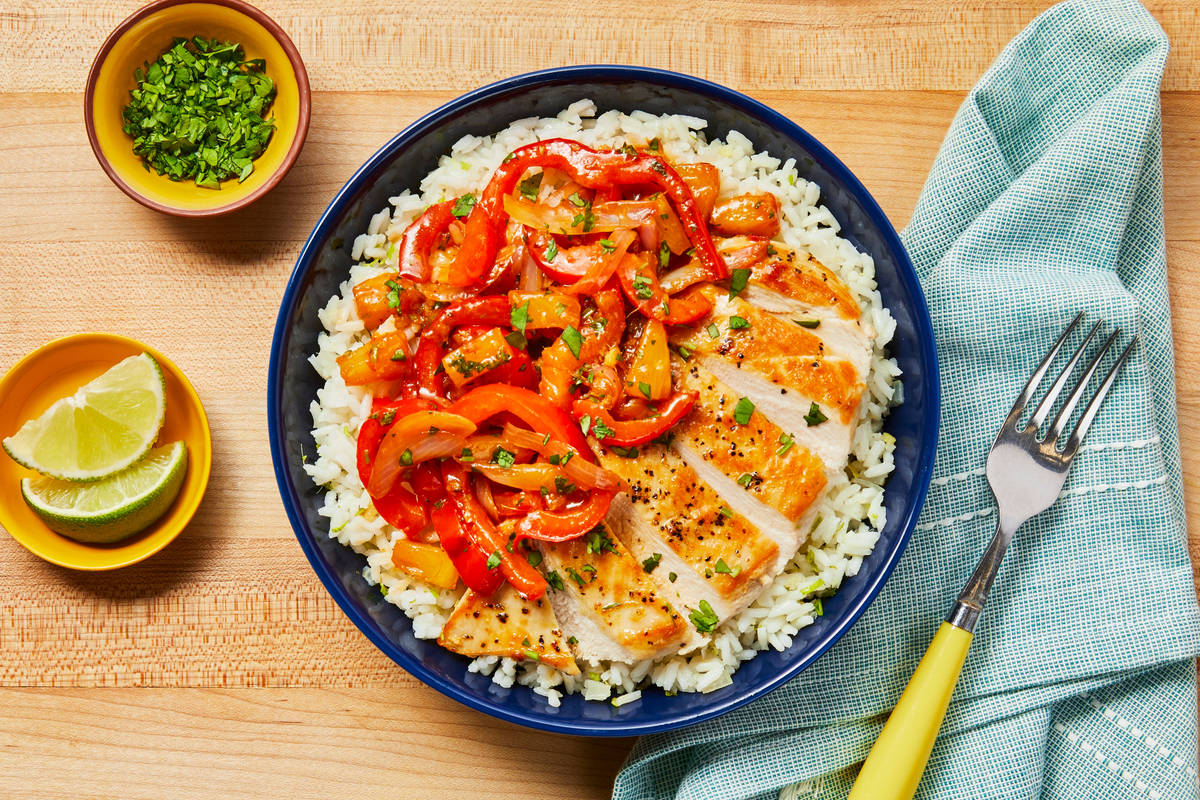 • Thinly slice chicken crosswise. • Fluff rice with a fork; stir in lime zest and 1 TBSP butter. Season with salt and pepper. • Divide rice between bowls; top with sliced chicken and saucy veggies. Sprinkle with remaining cilantro. Serve with remaining lime wedges on the side.