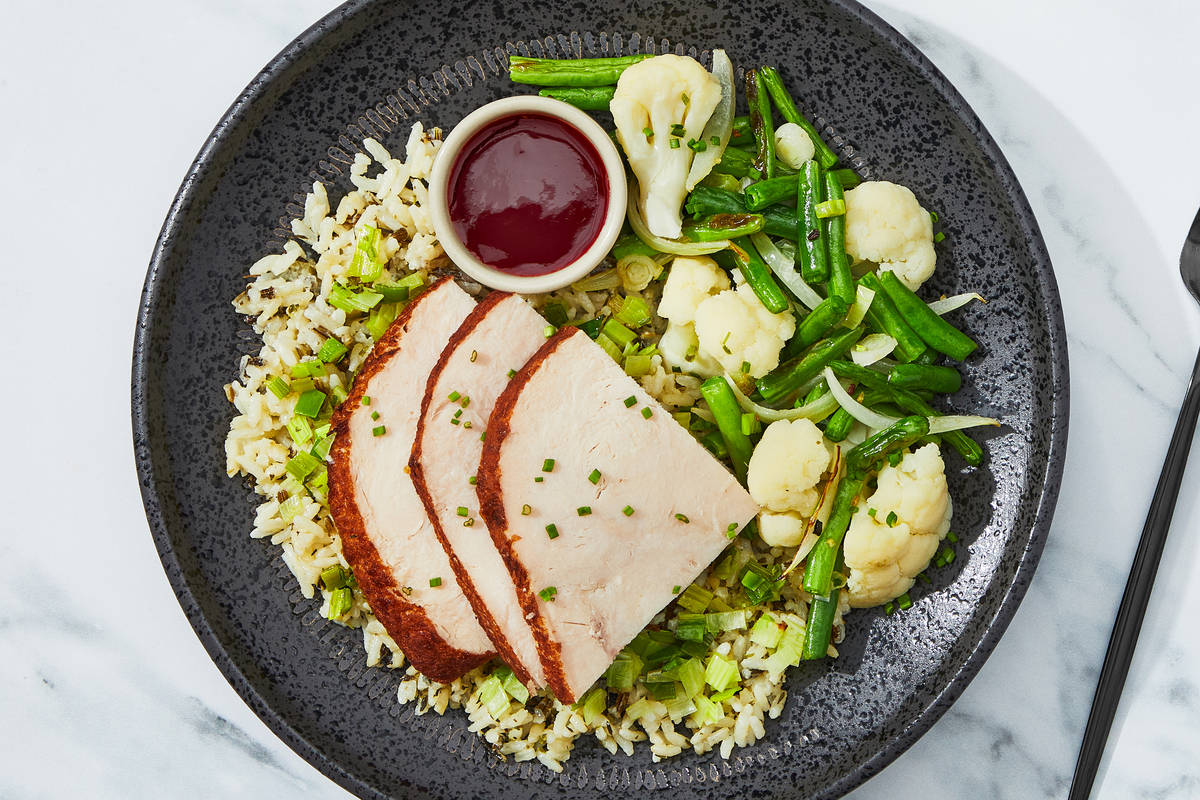 Sliced roasted turkey breast is layered over a sage-infused wild rice blend enriched with goat cheese. It’s topped with buttery braised leeks and served with a sweet-tart housemade cherry jam. Garlic-chive-roasted cauliflower and cut green beans complete the dish. Ingredients: Turkey Breast (Turkey Breast, Turkey Stock, Contains 2% Or Less Vinegar, Salt, Dried Onion, Spices), Green Beans, Water, Cauliflower, Leeks, Sour Cherries, Long Grain And Wild Rice Blend (Long Grain Parboiled Rice (Enriched With Iron (Ferric Orthophosphate), Niacin, Thiamine Mononitrate, Folic Acid), Wild Rice), Onions, Whole Milk (Pasteurized Milk, Vitamin D3), Honey, Cream Cheese (Pasteurized Milk And Cream, Salt, Cheese Culture, Stabilizers (Xanthan Gum, Carob Bean Gum, Guar Gum)), Goat Cheese (Whole Pasteurized Goat Milk, Salt, Cheese Culture, Enzymes), Olive Pomace Oil (Refined Olive Pomace Oil, Extra Virgin Olive Oil), Unsalted Butter (Pasteurized Cream, Natural Flavorings), Mirepoix Concentrate (Vegetable Stock (Carrot, Celery And Onion Stocks), Sea Salt, Carrot Stock, Tapioca Starch, Cabbage Juice Concentrate, Celery Stock, Onion Stock, Natural Flavors, Mushroom Stock, Tomato Paste), Garlic, Parsley, Lemon Juice, Green Onions, Rubbed Sage, Sea Salt, Toasted Garlic, Dried Onion Flakes, Dried Chives, Cornstarch, Granulated Garlic, Tomato Powder (Tomato Powder, Silicon Dioxide (Anti-Caking Agent)), Granulated Onion, Black Pepper, Dried Parsley, Smoked Black Pepper (Pepper, Smoke Flavor), Granulated Green Onion, Rosemary, Thyme, Nonfat Dry Milk (Nonfat Dry Milk, Lactose, Vitamin A Palmitate, Vitamin D3), Dried Oregano The nutrition facts are based off of the recommended serving size. Serving Size = 1 Tray (394g)