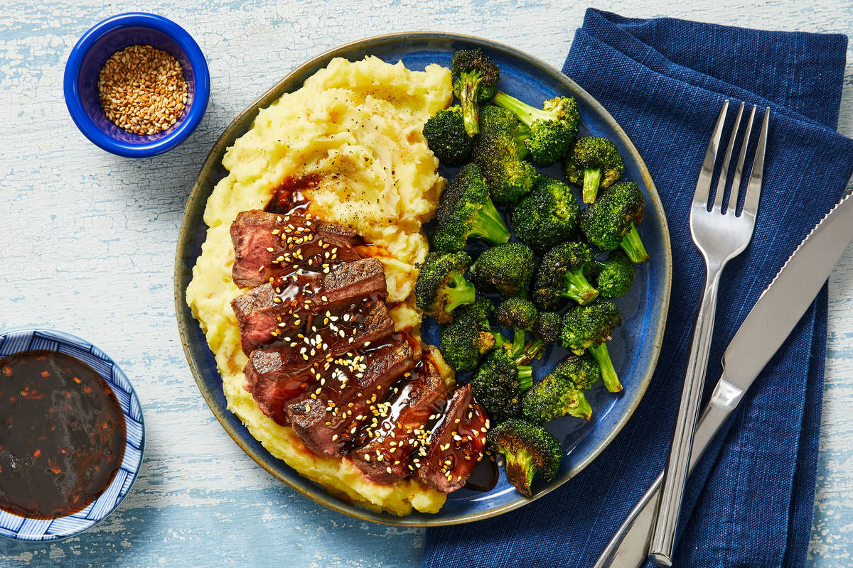 Hankering for a plate of good ol’ steak and potatoes? We’ve got your back. This recipe takes the classics above and beyond with a few flavorful twists. There’s seared steak, creamy wasabi-spiked mashed potatoes, and sesame-sprinkled roasted broccoli. And on top? Sweet teriyaki sauce and fresh ginger create a rich elixir you’ll want to drizzle over everything. And now you can!