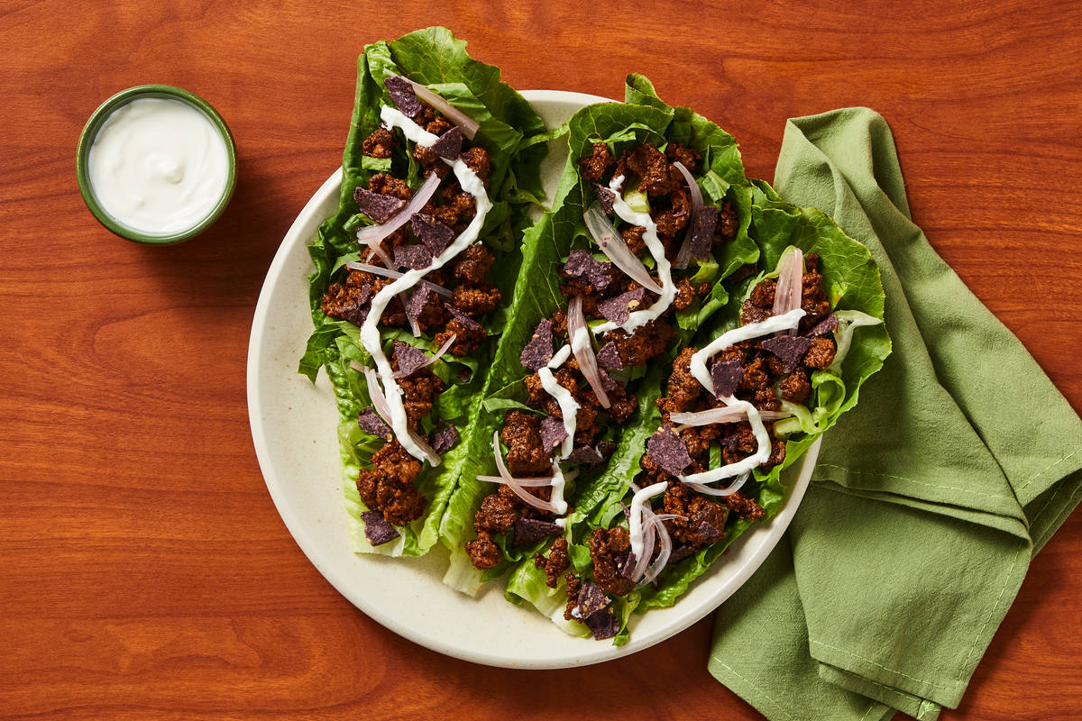 For a lighter spin on loaded beef burritos, we turn to crisp, refreshing baby lettuce leaves. Load up those leaves with Tex-Mex-spiced ground beef sizzled to perfection in a hot pan, then top with pickled shallot, sour cream, and crunchy tortilla chips for the perfect balance of hearty flavor and crisp, crunchy texture—all in 20 minutes!