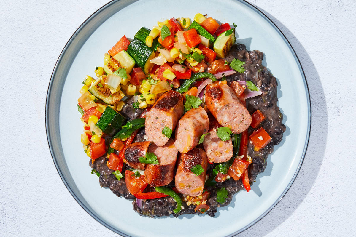 Ingredients: Smoked Pork & Bison Jalapeño Cheddar Bratwurst (Pork, Bison, Water, Cheddar Cheese (Pasteurized Milk, Cheese Cultures, Salt, Enzymes, Annatto Vegetable Color (If Colored), Potato Starch, Corn Starch And Cellulose (Anti-Caking Agents)), Nonfat Dry Milk, Sea Salt, Vinegar, Jalapeno Granules, Onions, Spices, Paprika, Garlic, Cultured Celery Powder, Ground Mustard), Stuffed In Pork Casings, Tomatoes, Zucchini, Black Beans (Prepared Black Beans, Water, Salt, And Calcium Chloride (Firming Agent)), Yellow Sweet Corn, Poblano Peppers, Onions, Red Bell Peppers, Garlic, Red Onions, Olive Pomace Oil (Refined Olive Pomace Oil, Extra Virgin Olive Oil), Water, Cilantro, Vinegar, Lime Juice (Water, Lime Juice From Concentrate), Sea Salt, Granulated Garlic, Black Pepper, Toasted Onion Powder, Cumin, Granulated Onion The nutrition facts are based off of the recommended serving size. Serving Size = 1 Tray (383g)