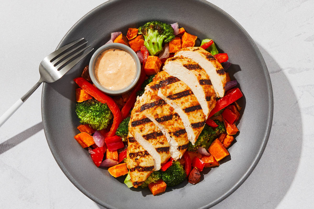 **Ingredients:** Boneless Chicken Breast With Rib Meat, Broccoli, Sweet Potatoes (Sweet Potatoes, Sodium Metabisulfite (Added To Maintain Color)), Red Bell Peppers, Red Onions, Olive Pomace Oil (Refined Olive Pomace Oil, Extra Virgin Olive Oil), Reduced Fat Milk (Pasteurized Reduced Fat Milk, Vitamin A Palmitate, Vitamin D3), Fire Roasted Tomatoes (Tomatoes, Tomato Juice, Sea Salt, Calcium Chloride, Citric Acid), Monterey Jack Cheese (Pasteurized Milk, Cheese Cultures, Salt, Enzymes, Anti-Caking Agents (Potato Starch, Powdered Cellulose), Natamycin (A Natural Mold Inhibitor)), Neufchatel Cheese (Pasteurized Milk And Cream, Skim Milk, Cheese Culture, Salt, Guar Gum, Carob Bean Gum, Xanthan Gum), Onions, Water, Garlic, Great Northern Beans (Prepared Great Northern Beans, Water, Salt, Calcium Chloride (Firming Agent)), Vinegar, Sea Salt, Lemon Juice, Black Pepper, Cumin, Ancho Chile Powder, Chili Powder (Chili Pepper, Spices (Including Mustard), Salt, Garlic Powder), Applewood Smoked Salt (Salt, Contains 2% Or Less Of Smoke Flavor), Granulated Onion, Toasted Garlic Powder, Granulated Garlic, Paprika (Paprika And Silicon Dioxide (Added To Make Free Flowing)), Smoked Paprika, Liquid Smoke (Water, Hickory Smoke Concentrate), Dried Oregano The nutrition facts are based off of the recommended serving size. Serving Size = 1 Tray (388g)