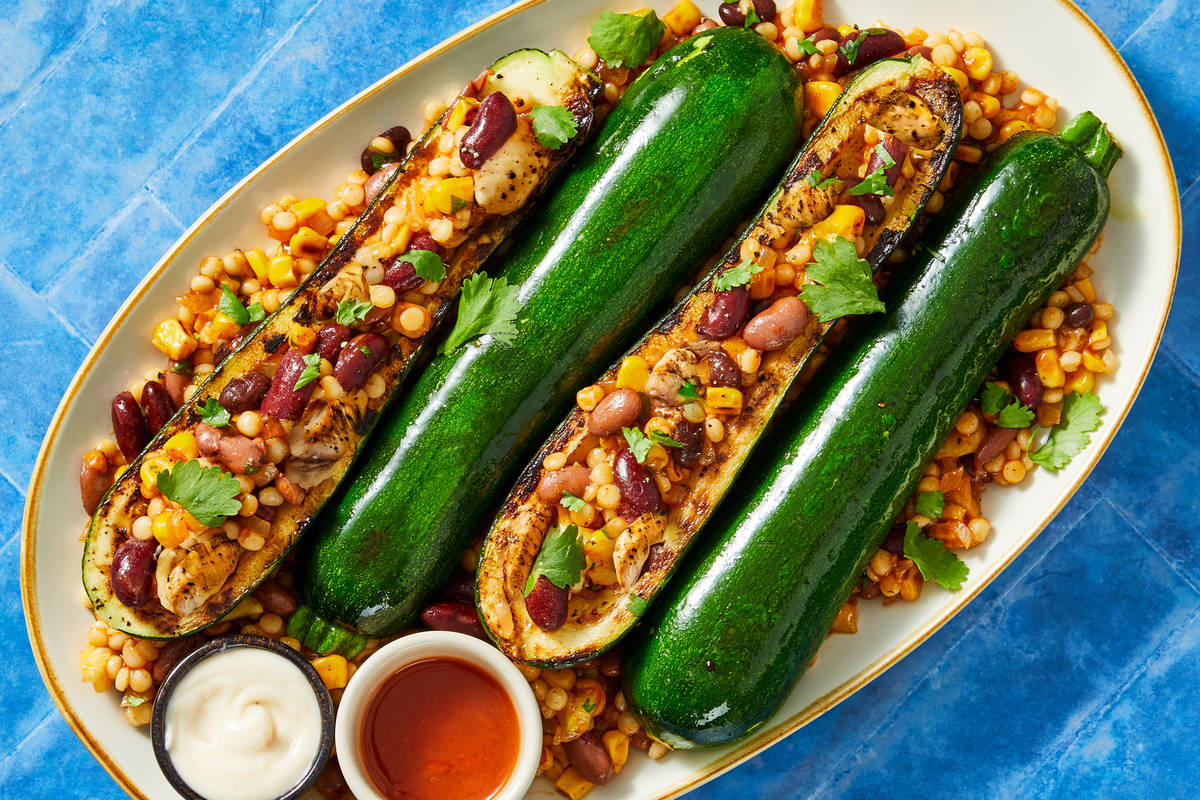 Transfer couscous to a serving dish and arrange roasted zucchini on top, cut sides down. Drizzle everything with vegan mayo sauce and as much hot sauce as you like. Top with remaining cilantro and serve family style.
