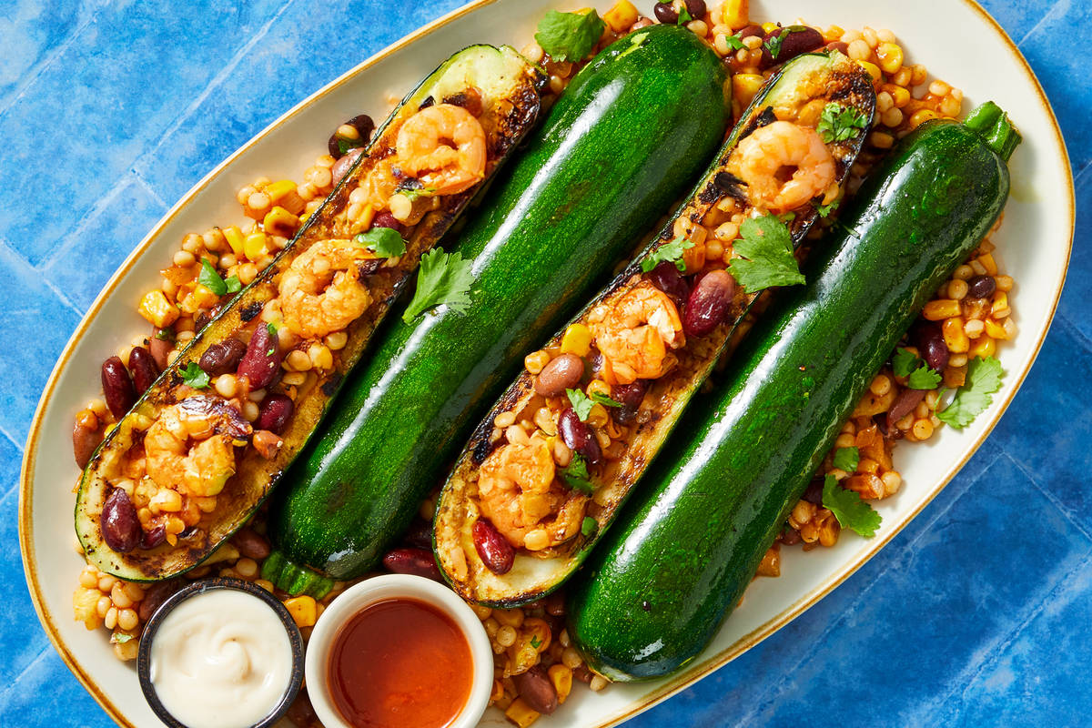 • Transfer couscous to a serving dish and arrange roasted zucchini on top, cut sides down. Drizzle everything with vegan mayo sauce and as much hot sauce as you like. Top with remaining cilantro and serve family style.