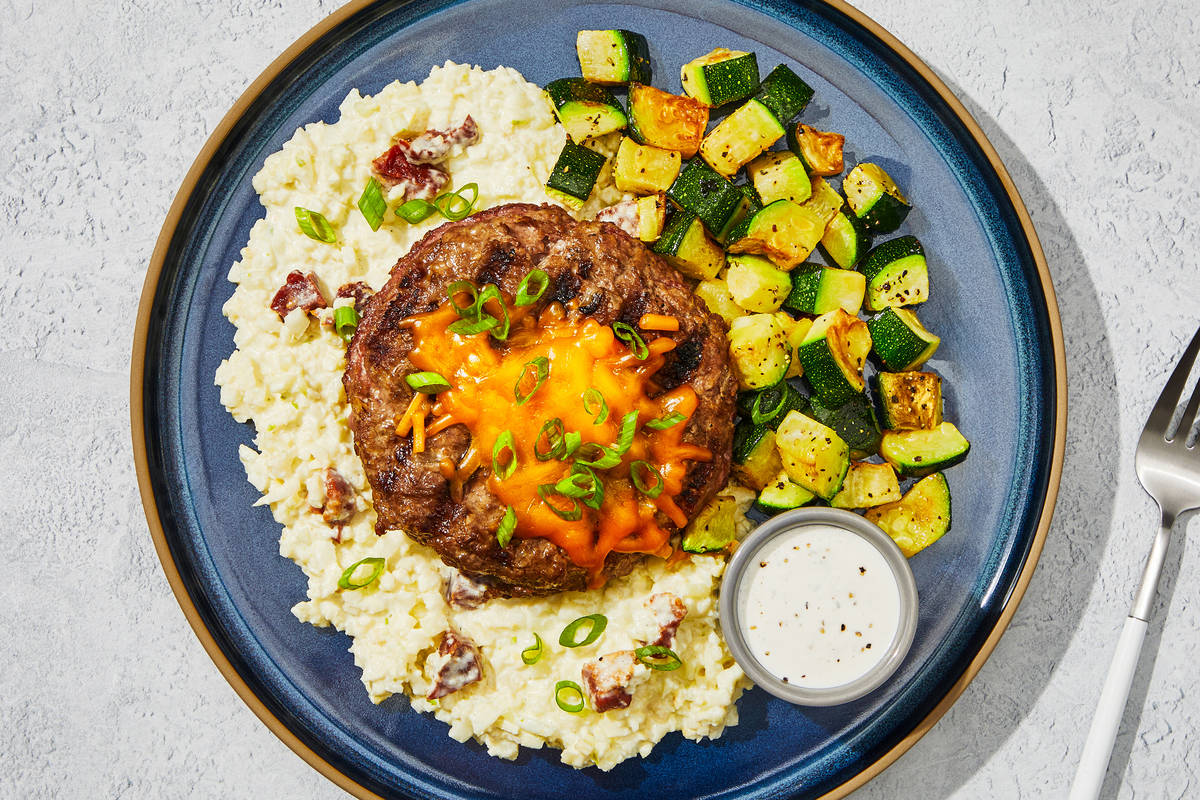 For a classic burger experience, these all-beef patties are charred to perfection and topped with sharp cheddar cheese. Served over our take on Southern grits, this creamy side is made with riced cauliflower tossed with bacon and jalapeño. The rich meal is rounded out with a side of garlicky roasted zucchini and served with ranch sour cream for slathering on your burger and dipping your zucchini.