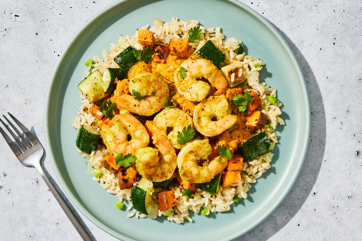 **Ingredients:** Shrimp (Shrimp, Water, Salt), Zucchini, Water, Sweet Potatoes (Sweet Potatoes, Sodium Metabisulfite (Added To Maintain Color)), Brown Jasmine Rice, Coconut Milk (Coconut, Water, Guar Gum, Coconut Milk And Water, Coconut Cream, Contains 1% Or Less Of: Coconut Water Concentrate, Gellan Gum, Natural Flavor, Sodium Citrate, Tricalcium Phosphate, Vitamin D2, Xanthan Gum), Whole Milk (Pasteurized Milk, Vitamin D3), Olive Pomace Oil (Refined Olive Pomace Oil, Extra Virgin Olive Oil), Neufchatel Cheese (Pasteurized Milk And Cream, Skim Milk, Cheese Culture, Salt, Guar Gum, Carob Bean Gum, Xanthan Gum), Green Onions, Ginger, Unsalted Butter (Pasteurized Cream, Natural Flavorings), Garlic, Toasted Sesame Oil, Heavy Cream (Heavy Cream, Milk, Gellan Gum, Sunflower Lecithin), Onions, Vinegar, Cilantro, Red Curry Paste (Dried Red Chili, Garlic, Lemongrass, Shallot, Salt, Galangal, Kaffir Lime Peel, Spices (Coriander Seed, Cumin Powder)), Yellow Curry Paste (Garlic, Dried Red Chili, Lemongrass, Shallot, Salt, Galangal, Kaffir Lime Peel, Coriander Seed, Curry Powder, Cumin, Cinnamon, Turmeric, Cardamon, Nutmeg), Granulated Onion, Curry Powder (Coriander, Fenugreek, Turmeric, Cumin, Black Pepper, Bay Leaves, Celery Seed, Nutmeg, Cloves, Onion, Red Pepper, Ginger), Tamari (Water, Soybeans, Salt, Alcohol (To Preserve Freshness), Lactic Acid, Rice Vinegar), Granulated Garlic, Lime Juice (Water, Lime Juice From Concentrate), Ground Ginger, Sea Salt, Gochugaru Chile Flakes, Coconut Sugar, Fish Sauce (Anchovy, Sea Salt), Sesame Seeds, Coconut Aminos (Coconut Nectar, Coconut Blossom Sap, Sea Salt), Lemongrass Powder The nutrition facts are based off of the recommended serving size. Serving Size = 1 Tray (371g)