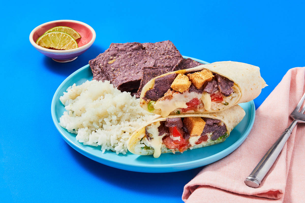 Now with more rice! You asked, we listened: This isn't the HelloFresh you remember. Bigger menu. Upgraded recipes. Increased portion sizes. More variety. The best way to cook dinner just got BETTER. What’s better than a burrito? A burrito you can really crunch into! You’ll fill warm tortillas with smoky spiced ground beef, scallion-lime rice, juicy tomato, creamy queso blanco, and the secret ingredient: crushed tortilla chips. With these beefy, cheesy, earth-shatteringly crunchy burritos, you can really let the good times roll (pun intended).
