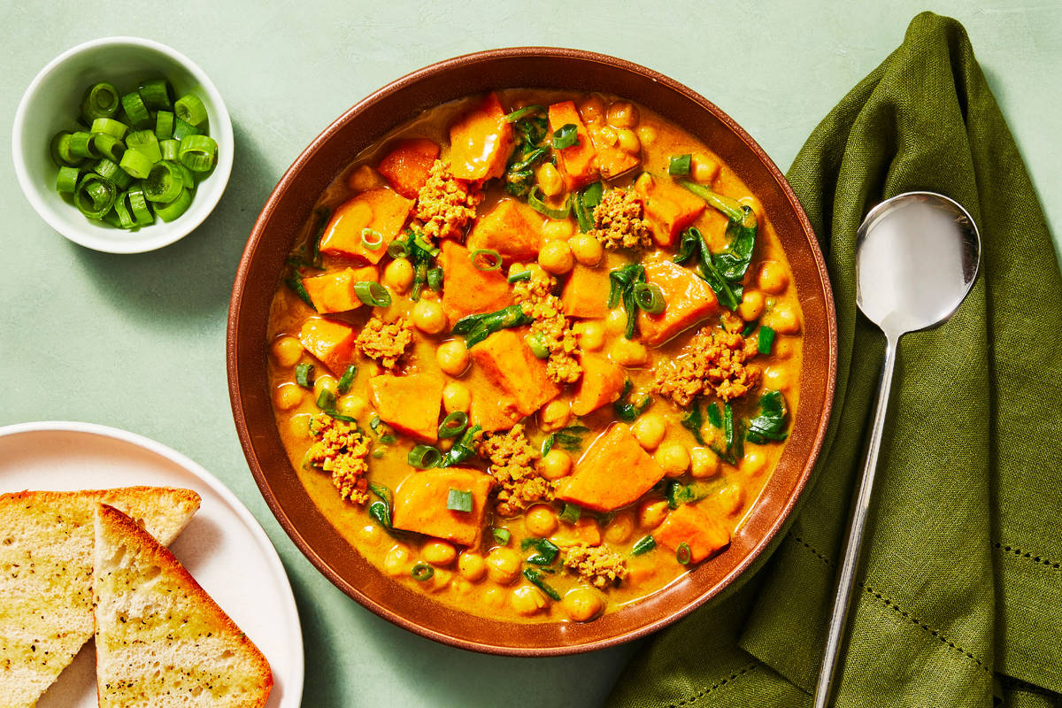 This hearty one-pot stew features sweet potato, chickpeas, and spinach in a creamy coconut curry base. Seasoned with Turkish spices and ginger, the curry is simmered to perfection and topped with fresh scallion greens. To complete the meal, there's crispy toasted ciabatta bread brushed with olive oil for dipping.