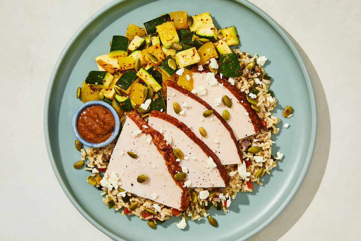 **Ingredients:** Zucchini, Turkey Breast (Turkey Breast, Turkey Stock, Contains 2% Or Less Vinegar, Salt, Dried Onion, Spices), Water, Yellow Bell Peppers, Brown Jasmine Rice, Red Bell Peppers, Poblano Peppers, Red Onions, Queso Fresco (Pasteurized Whole Cow'S Milk, Salt, Enzymes, Culture, And Powdered Cellulose (To Prevent Caking)), Concentrated Crushed Tomatoes (Tomatoes, Salt, Citric Acid), Olive Pomace Oil (Refined Olive Pomace Oil, Extra Virgin Olive Oil), Pepitas, Onions, Peanut Butter, Cilantro, Vinegar, Jalapeño Peppers, Garlic, Blue Agave Nectar, Brown Chicken Stock (Chicken Stock, Mirepoix Stock (Made Of Carrot, Celery And Onion Stocks), Salt, Gelatin, White Wine), Cocoa Powder, Toasted Garlic, Sea Salt, Paprika (Paprika And Silicon Dioxide (Added To Make Free Flowing)), Cumin, Chili Powder (Chili Pepper, Spices (Including Mustard), Salt, Garlic Powder), Black Pepper, Coconut Sugar, Guajillo Chile Powder, Toasted Onion Powder, Dried Oregano, Brown Chipotle Chile Powder, Ancho Chile Powder, Gochugaru Chile Flakes, Cinnamon, Granulated Garlic, Thyme, Coriander, Bay Leaf Powder The nutrition facts are based off of the recommended serving size. Serving Size = 1 Tray (363g)