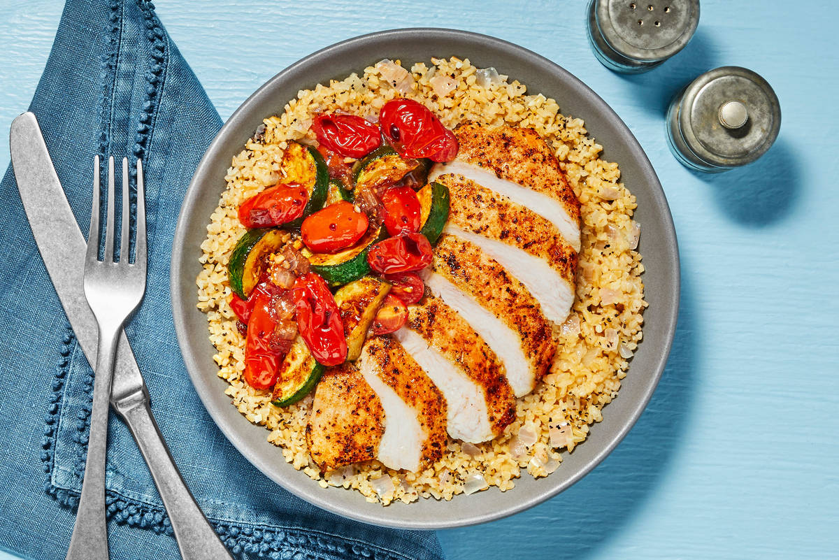 Buckle up, because the power bowl just got a whole lot more powerful. Here, earthy bulgur wheat simmers with onion, garlic, and stock to form the hearty base. It’s topped with tender Tuscan-spiced chicken and a tangy, sweet, and savory topping of balsamic tomato and zucchini. One bite, and we think you’ll agree: It really doesn’t get much better than digging into all that!