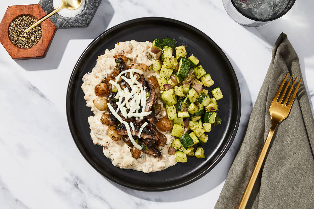 Inspired by the beloved hors d’oeuvre, our chefs deconstructed sausage-stuffed mushrooms into a luxurious entrée. We top Italian pork sausage and spinach with sweet balsamic pearl onions. That’s all nestled under roasted portobello mushrooms and a melty layer of mozzarella. Roasted zucchini with Italian herbs and red onions completes this hearty meal.