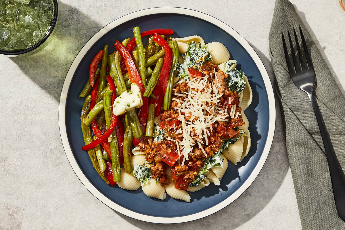 In this flavorful Italian-inspired dish, cauliflower pasta shells are topped with a luscious spinach and chive ricotta, draped in a sausage and roasted red pepper marinara sauce, and finished with Parmesan. On the side, roasted garlicky green beans and red bell peppers are topped with a dollop of melty chive butter. **Ingredients:** Cauliflower Shells (Water, Cauliflower Powder, Potato Starch, Tapioca Starch, Whole Egg, Egg White, Xanthan Gum, Konjac, Salt), Green Beans, Red Bell Peppers, Italian Pork Sausage (Pork, Water, Salt, Spices, Paprika), Diced Tomatoes (Tomatoes, Tomato Juice, Salt, Calcium Chloride, Citric Acid), Water, Ricotta Cheese (Pasteurized Milk, Pasteurized Whey, Pasteurized Cream, Vinegar, Salt, Stabilizers (Xanthan Gum, Locust Bean Gum, Guar Gum)), Garlic, Shredded Parmesan Cheese (Pasteurized Part-Skim Milk, Cheese Culture, Salt, Enzymes, Powdered Cellulose (Added To Prevent Caking), Natamycin (A Natural Mold Inhibitor And To Protect Flavor)), Red Onions, Unsalted Butter (Pasteurized Cream, Natural Flavorings), Onions, Olive Pomace Oil (Refined Olive Pomace Oil, Extra Virgin Olive Oil), Neufchatel Cheese (Pasteurized Milk And Cream, Skim Milk, Cheese Culture, Salt, Guar Gum, Carob Bean Gum, Xanthan Gum), Celery, Tomato Paste (Tomatoes, Citric Acid), Roasted Garlic Oil (Olive Pomace Oil (Refined Olive Pomace Oil, Extra Virgin Olive Oil) Garlic), Spinach, Vinegar, Granulated Garlic, Tomato Powder (Tomato Powder, Silicon Dioxide (Anti-Caking Agent)), Sea Salt, Black Pepper, Smoked Black Pepper (Pepper, Smoke Flavor), Dried Basil, Dried Parsley, Thyme, Dried Chives, Dried Oregano The nutrition facts are based off of the recommended serving size. Serving Size = 1 Tray (303g)