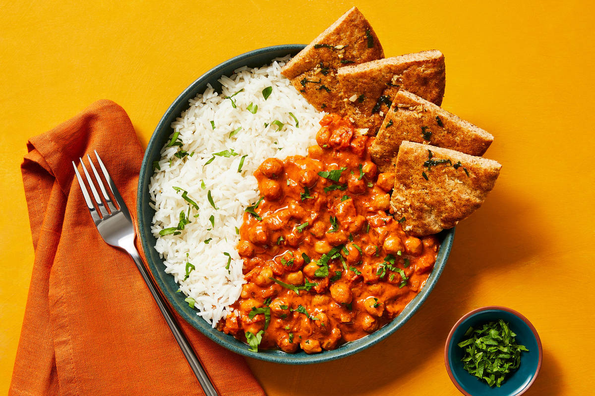Curries are one of those meals that warms your heart and your belly, and tonight’s vegan version is no exception. Chickpeas, onion, and tomatoes get a super savory treatment in a curry sauce made creamy with coconut milk. Spoon all this deliciousness over fluffy basmati rice, sprinkle with fresh cilantro, and serve with garlicky pita wedges for soaking up the curry. It’s one soul-satisfying meal!