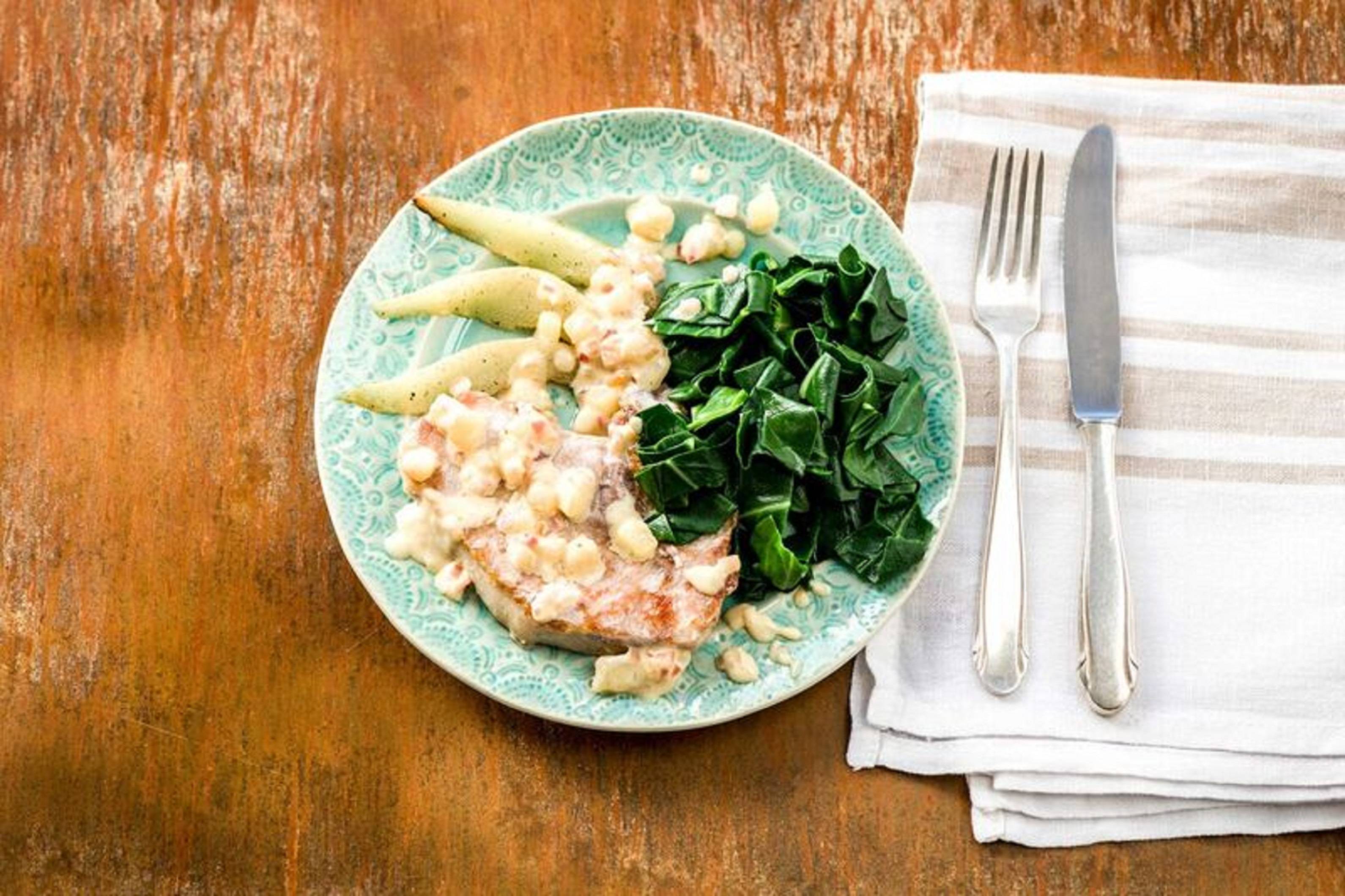 • Add drained penne to pan with sauce and toss to coat. If needed, stir in more reserved pasta cooking water a splash at a time until pasta is coated in a creamy sauce. Taste and season with salt and pepper. • Slice chicken crosswise. • Divide pasta between bowls. Top with chicken and sprinkle with crispy onion. Serve.