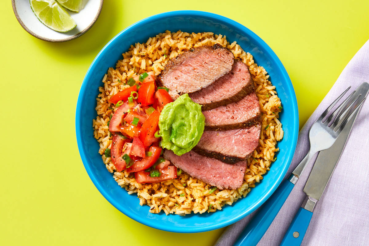 If you take all the best ingredients from a burrito, lose the tortilla, and serve them in a bowl, that’s what we’re serving up! You’ll sear marinated steak seasoned with our bold Mexican spice blend to juicy perfection, then nestle it on top of zesty garlic rice, and serve with tangy marinated tomato and a big dollop of guacamole. Add a squeeze of lime juice just before digging in, and in 25 quick minutes you’re ready for this delicious at-home spin on a burrito bowl.